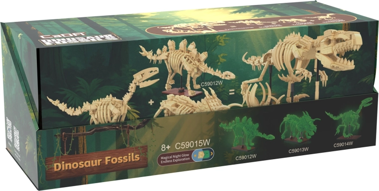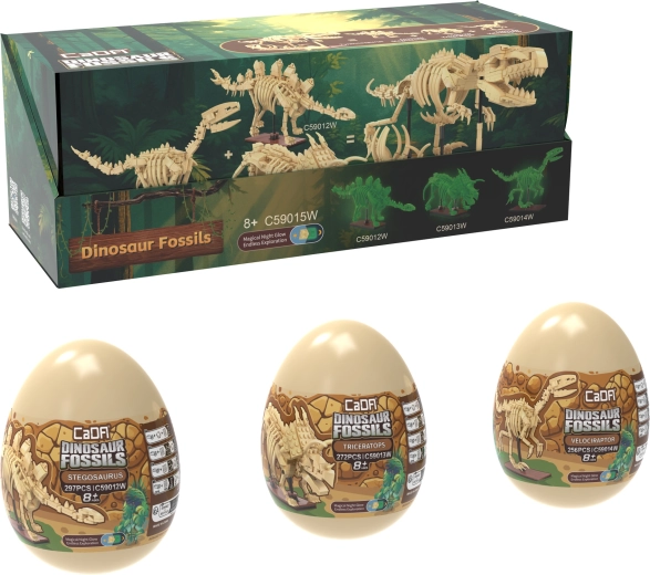 CaDA Dinosaur Fossils konstruktors iepriecinās gan mazus, gan lielus aizvēstures un izglītojošu modeļu fanus. No kvalitatīvām detaļām izveidosiet trīs iespaidīgus skeletu eksponātus ar locītavās kustīgām ekstremitātēm, asti un žokli, kurus var noformēt dažādās pozās. Speciālais kaulu materiāls spīd tumsā, tāpēc modeļi kļūst par oriģinālu dekoru arī pēc tumsas iestāšanās.