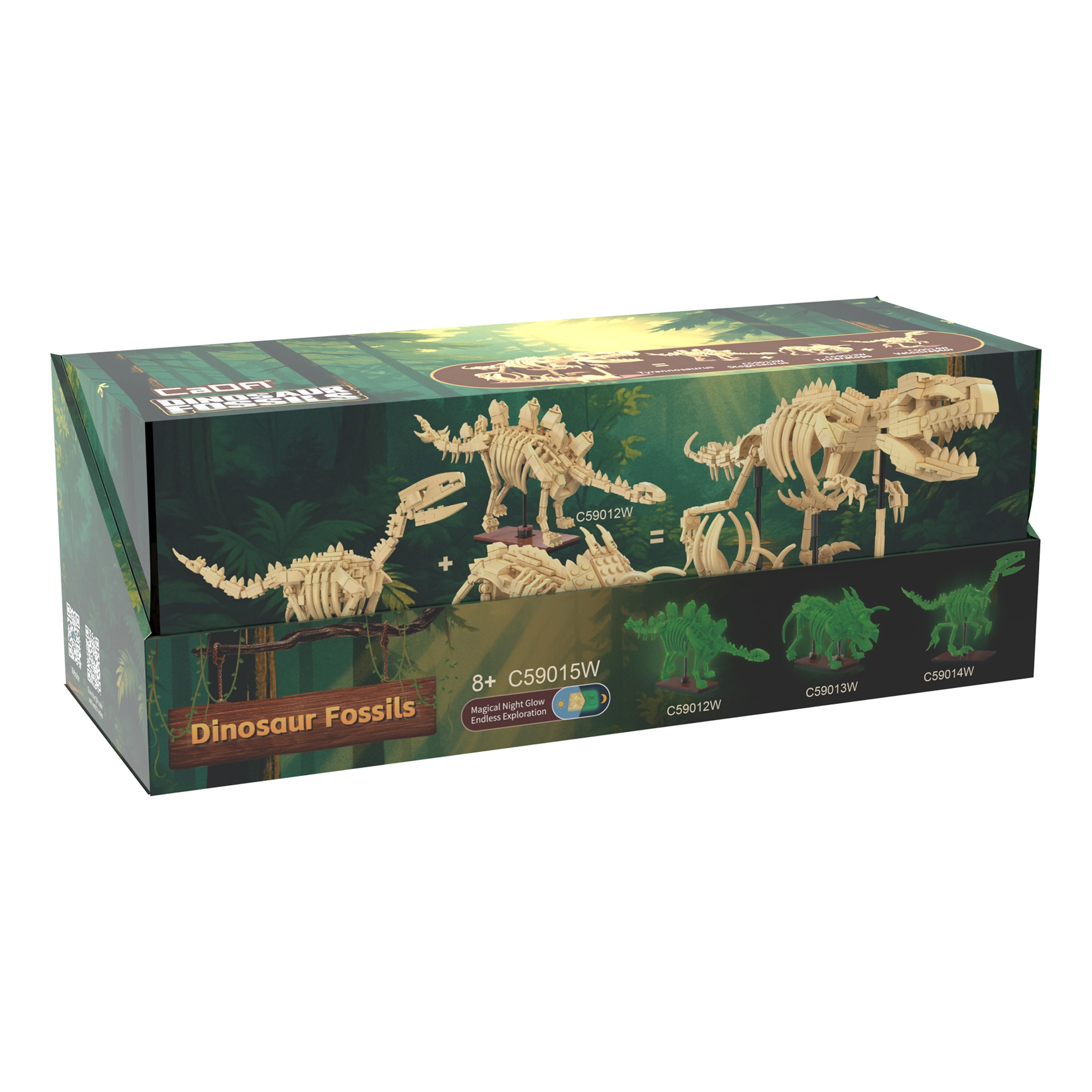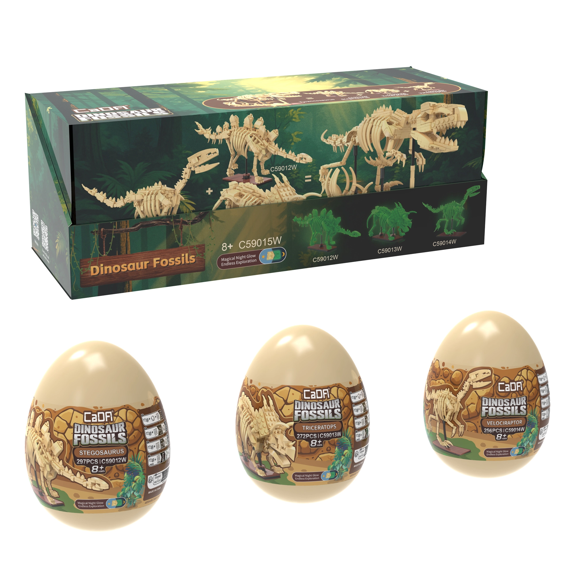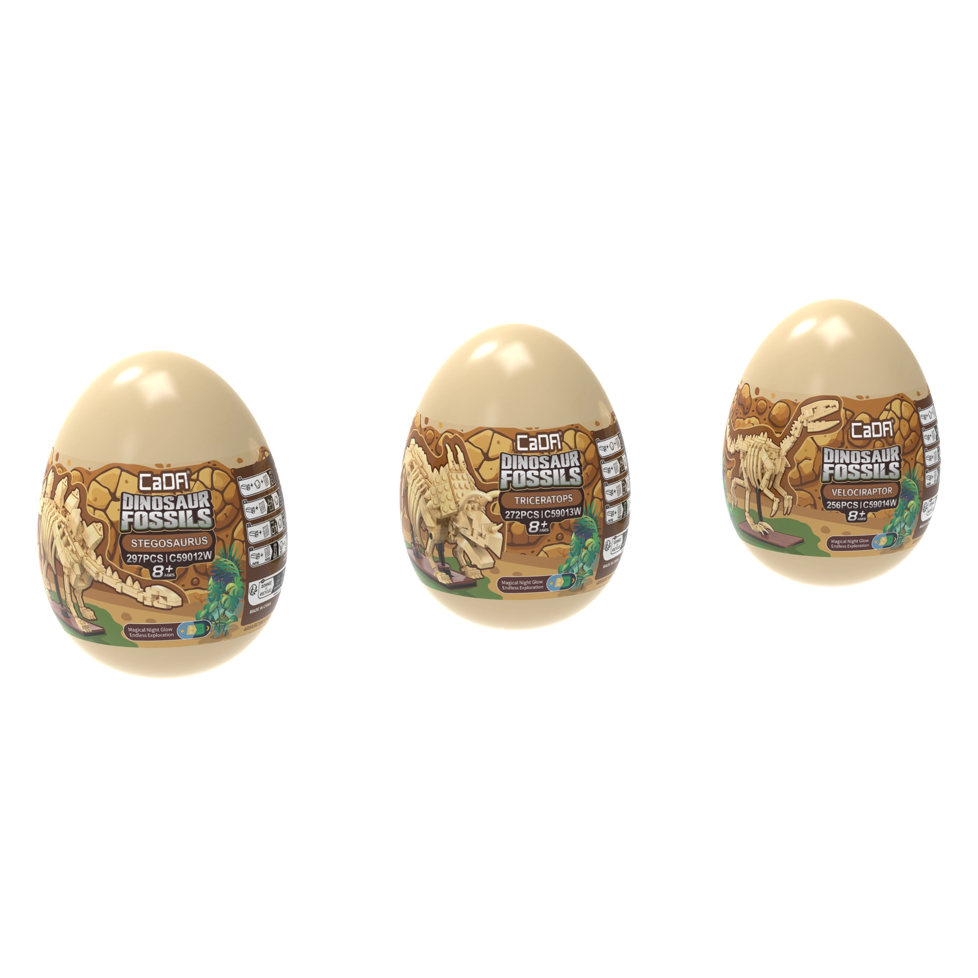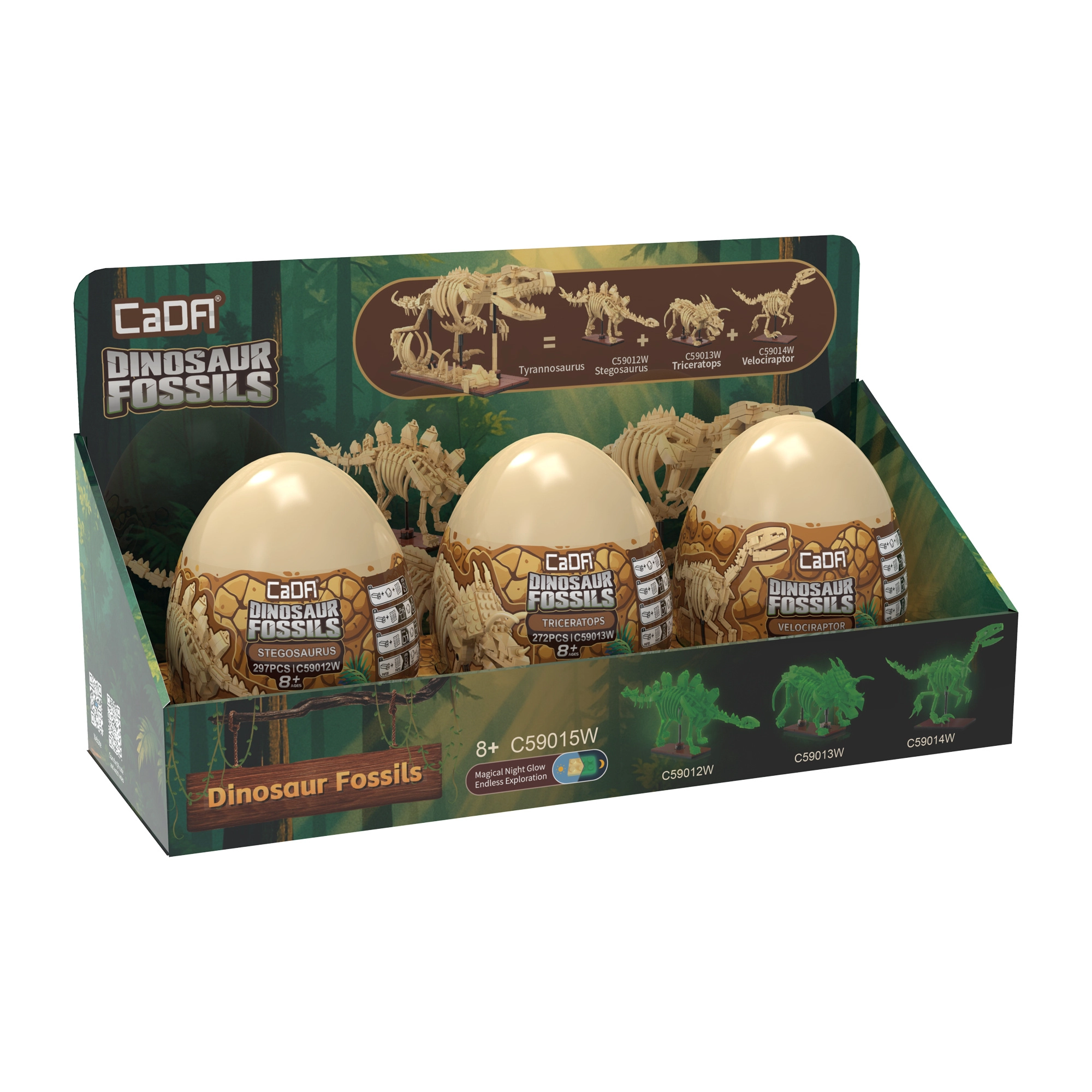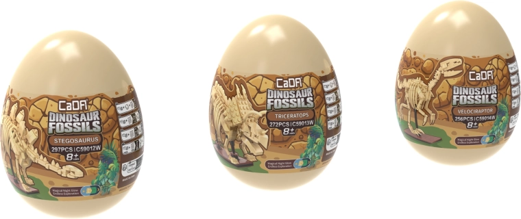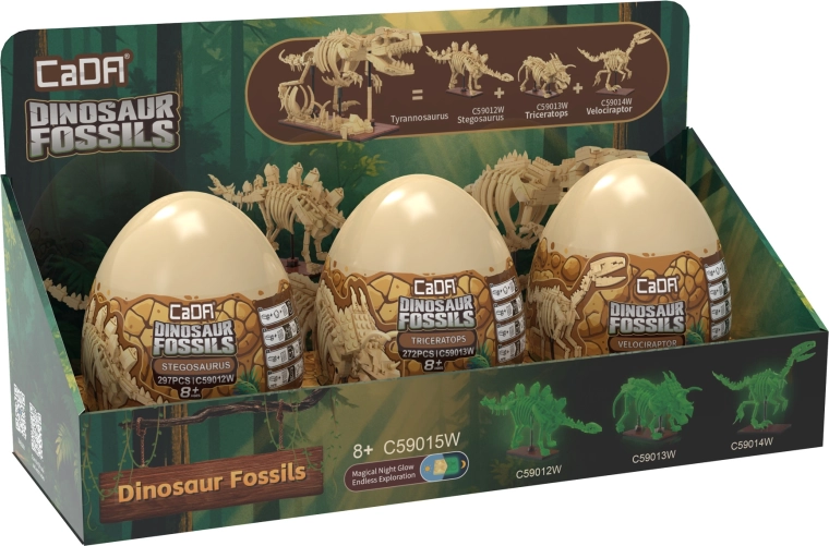 Atklājiet fascinējošo dinozauru pasauli ar CaDA Dinosaur Fossils konstruktoru. Salieciet trīs detalizētus skeletu modeļus – Triceratopsu, Stegozauru un Velociraptoru – un pēc tam apvienojiet tos iespaidīgā TYRANNOSAURUS REX. Detaļām ir spīdošs efekts tumsā, locītavas ir kustīgas, un komplektā ir pavisam 825 savietojamas detaļas praktiskās kolekcionāru “olās”.