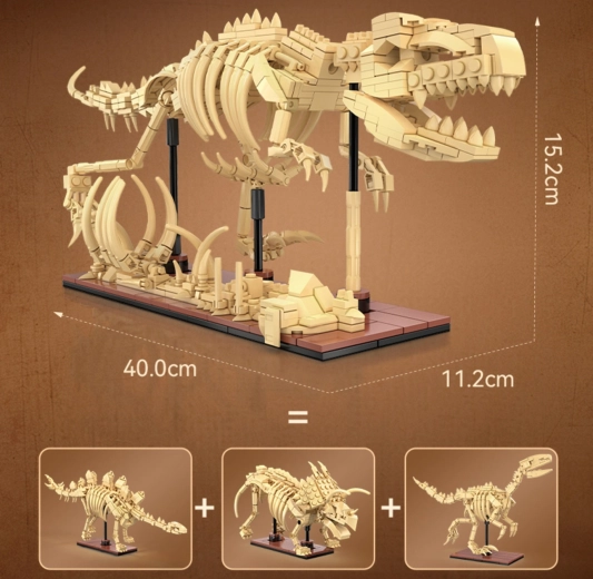 Salieciet detalizētus Triceratopsa, Stegozaura un Velociraptora skeletus no 825 detaļām un izstādiet tos uz statīviem. Katram modelim ir kustīgas locītavas dinamiskām pozām.