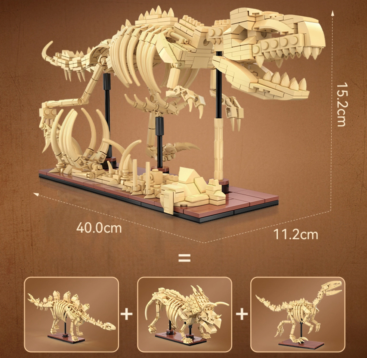 - Triceratops: 24 × 12,8 × 9,6 cm; Stegozaurs: 38,4 × 14,4 × 8 cm; Velociraptors: 26,2 × 14,1 × 7,2 cm