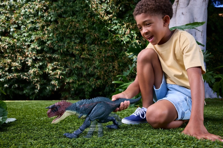 Šī detalizēti izstrādātā Jurassic World sērijas figūra ienesis bērnu istabā intensīvu darbību. Inovatīvs mehānisms, ko aktivizē poga astes pamatnē, pārvieto kājas skrējiena pozā, atver žokļus un aktivizē spēcīgus dinozaura rūcienus vēl iespaidīgākai spēlei. Raksturīgie ragi, teksturētā āda un filmu detaļas to padara par lielisku gabalu gan spēlei, gan izvietošanai plauktā.