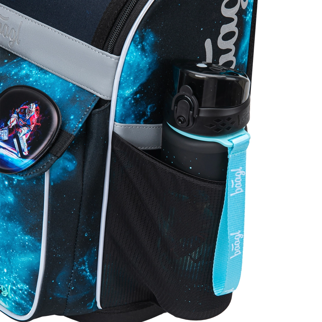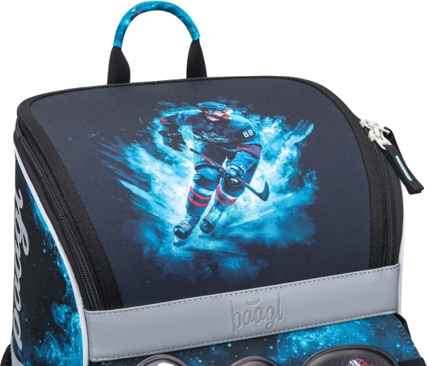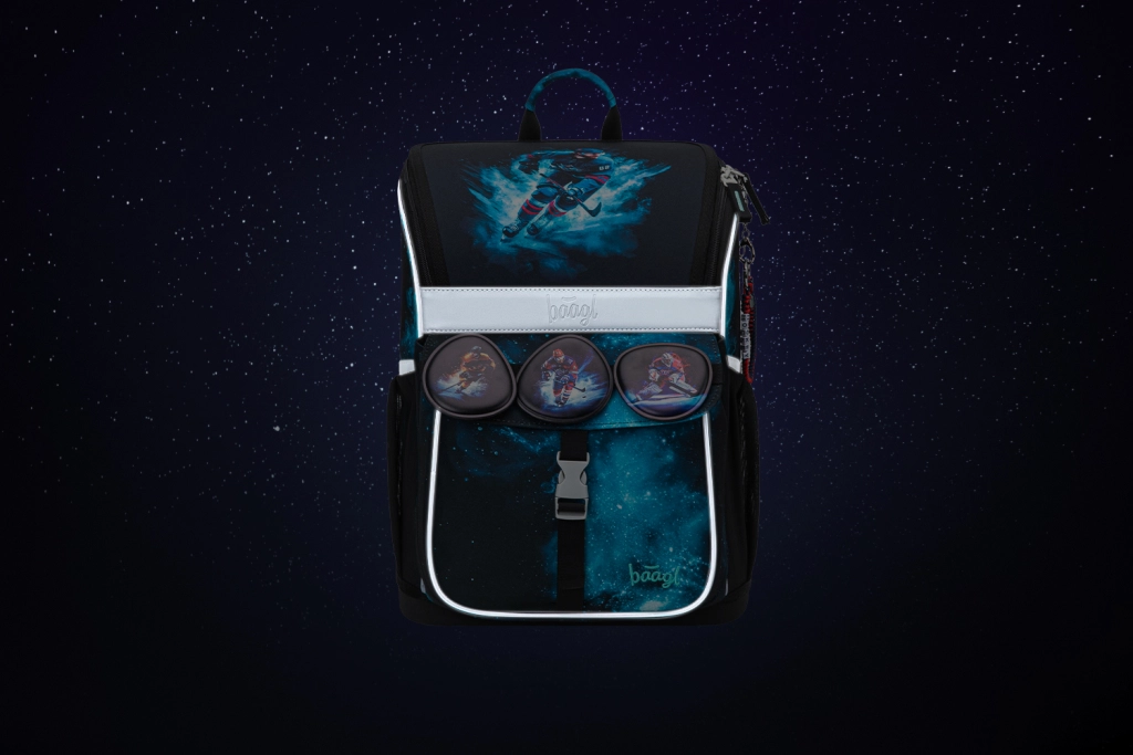 Pilns skolas aprīkojums pirmklasniekiem un jaunākiem skolēniem ar hokeja motīvu: ergonomiska Zippy aktovka ar augošu muguras sistēmu, ietilpīgs penālis, praktisks maisiņš maiņas apaviem/sporta nodarbībām, maks uz kakla un atstarojoši elementi drošībai. Izturīgi materiāli, uzticami YKK rāvējslēdzēji, pārdomāta organizācija un atstarojošas detaļas labākai redzamībai.