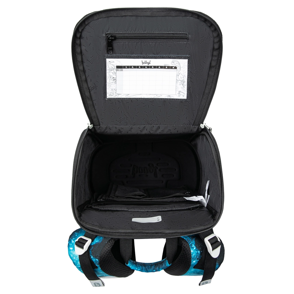 Atverams vāks ērtai ielikšanai no soliņa, ietilpīga galvenā kamera ar iekšējo kabatu, sieta kabata vākā, gumija mācību grāmatu fiksēšanai un sānu kabatas pudelei.