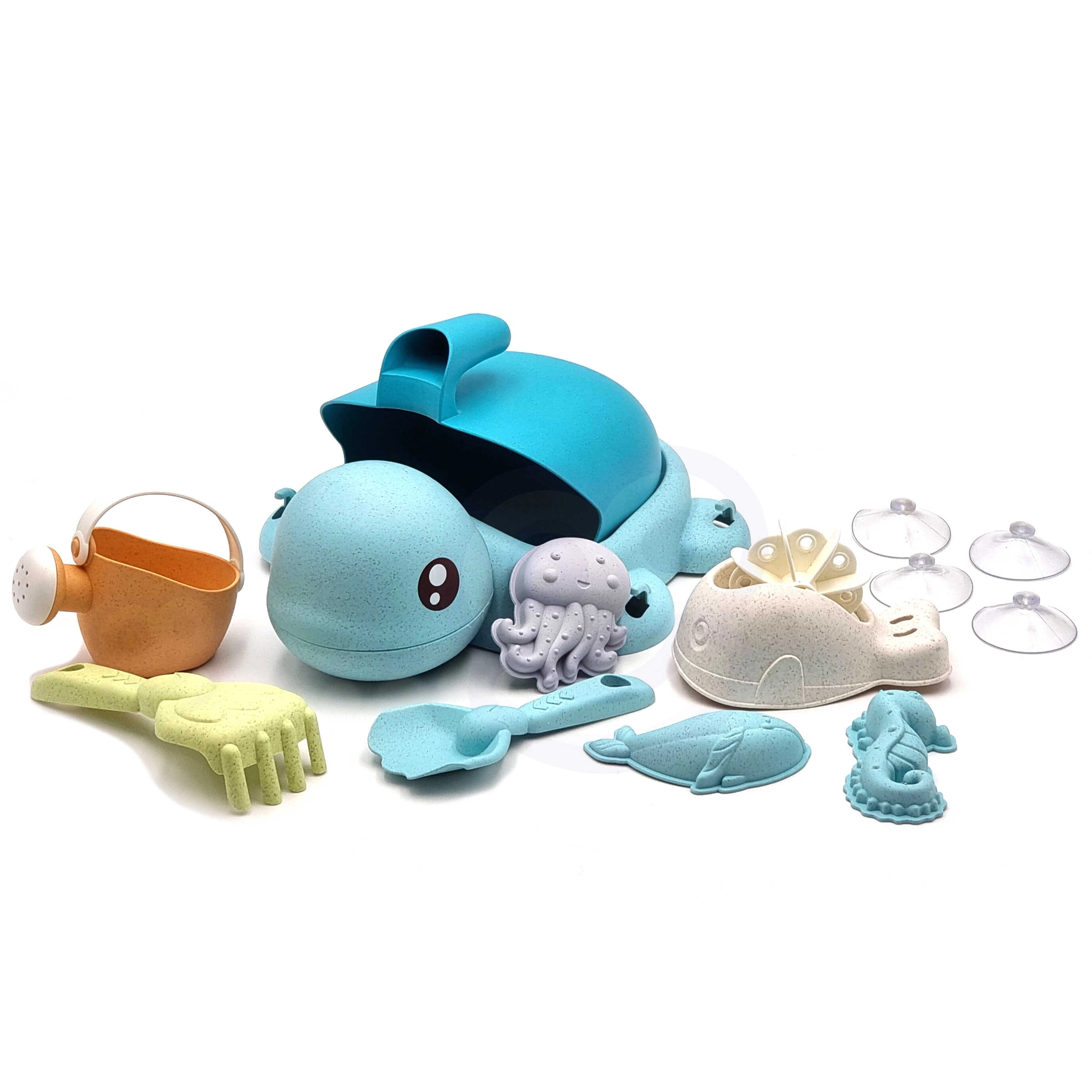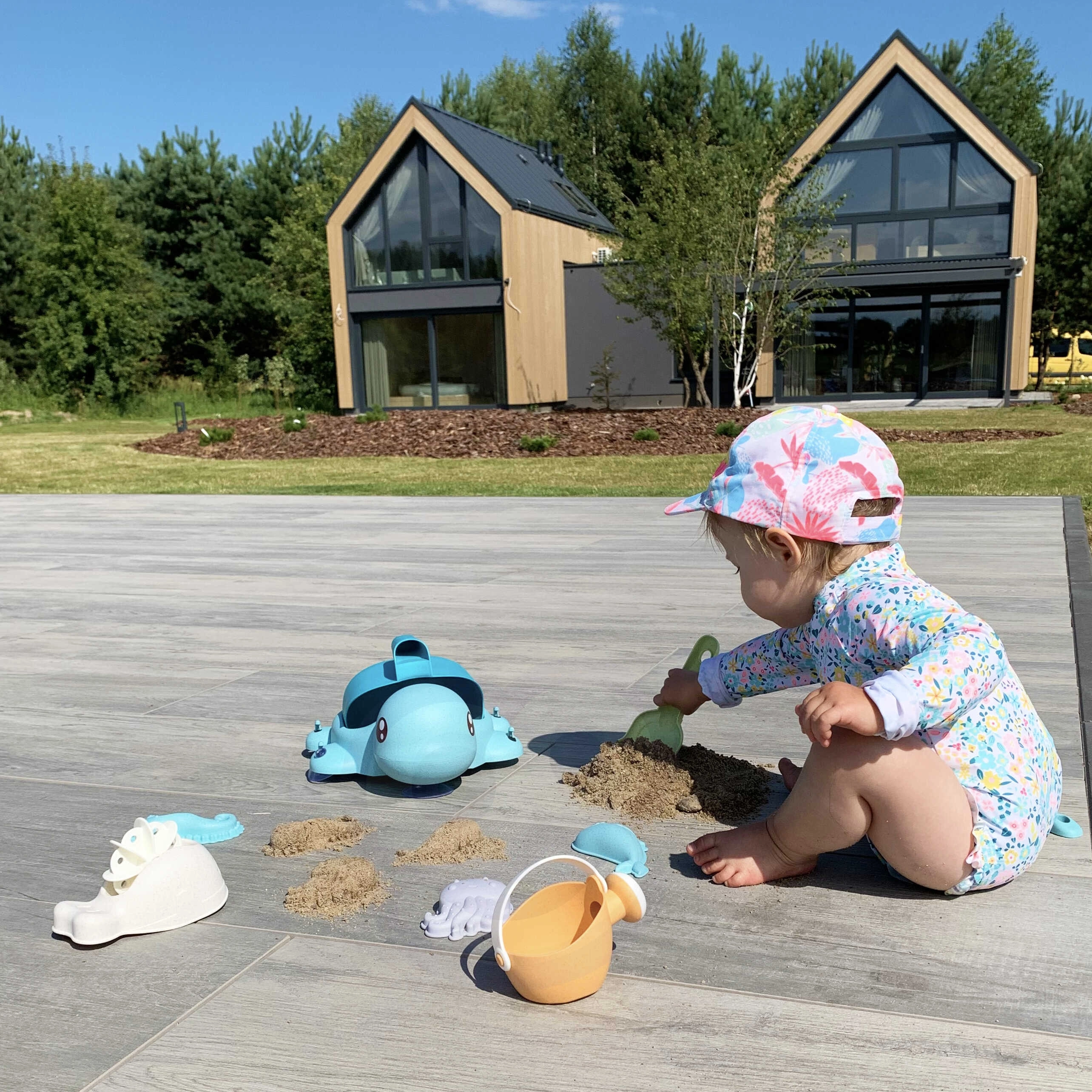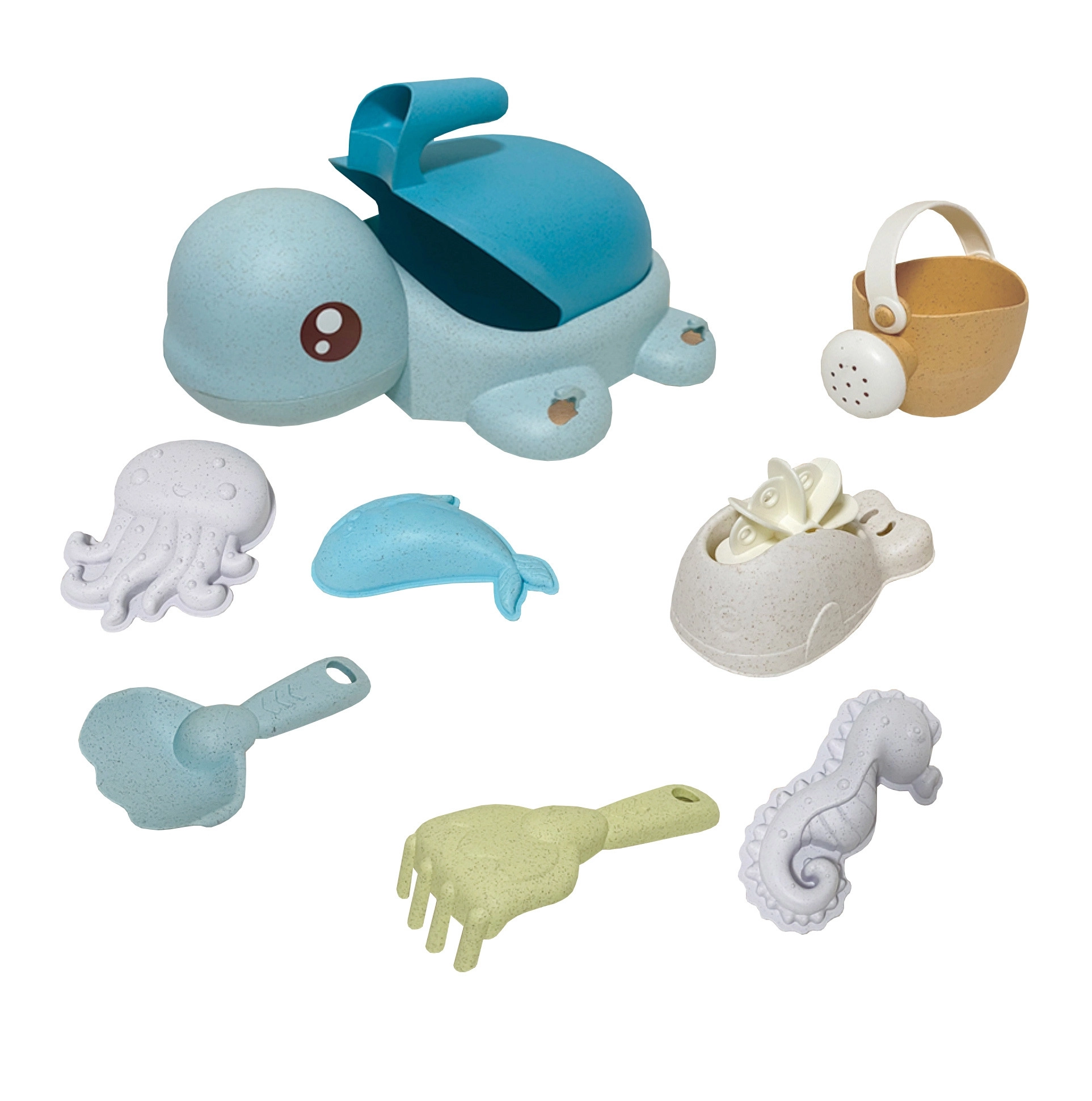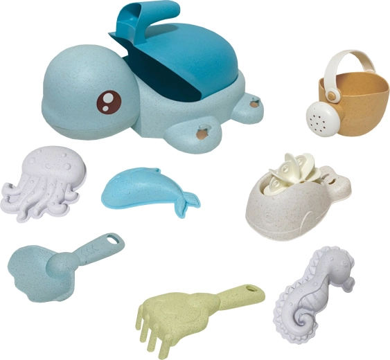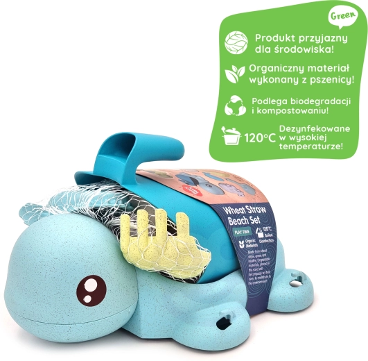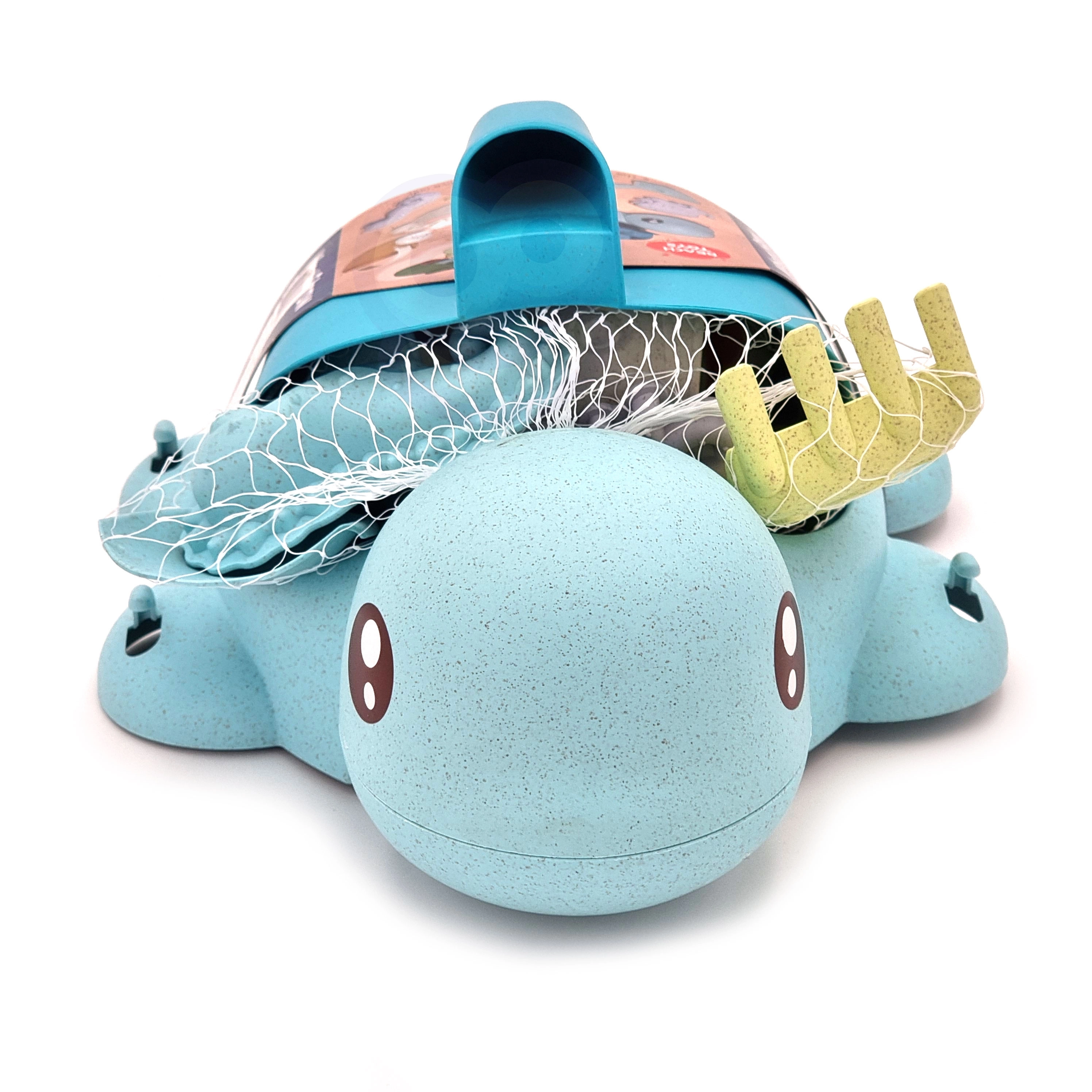 Mīlīgs bruņurupucītis slēpj pilnu komplektu smiltīm un ūdenim – kopā 8 daļas maigās pasteļkrāsās. Izgatavots no organiska, bioloģiski noārdāma materiāla, kas ir saudzīgs dabai, drošs bērniem un ideāli piemērots smiltīm, pludmalei, dārzam un vannai.
