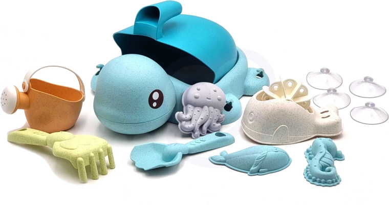 - 8 daļu aprīkojums: bruņurupucītis–kaste, lāpstiņa, grābeklis, karote/kauss, lejkanna, 3 formiņas un ūdens ratiņš ar piesūcekņiem.