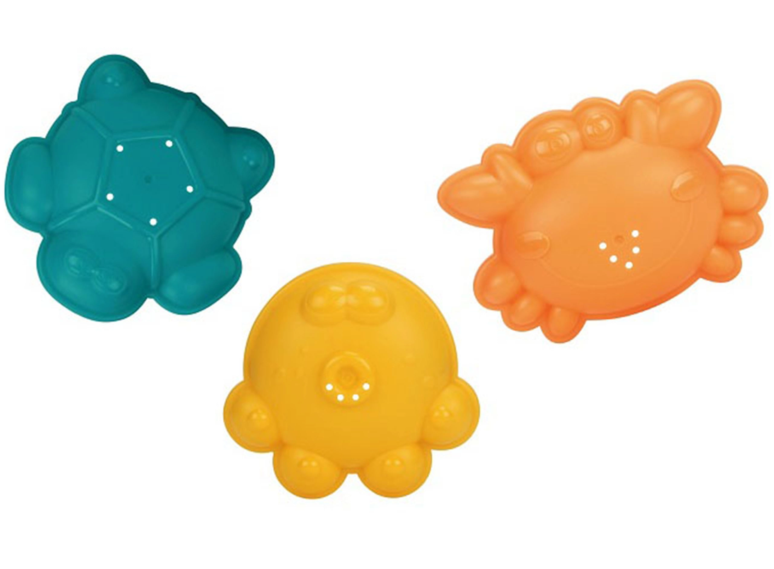 Trīs krāsainas formiņas rosina iztēli un radošumu smiltīs un ūdenī. Bērni viegli izveidos bruņurupuci, krabi vai astoņkāji.