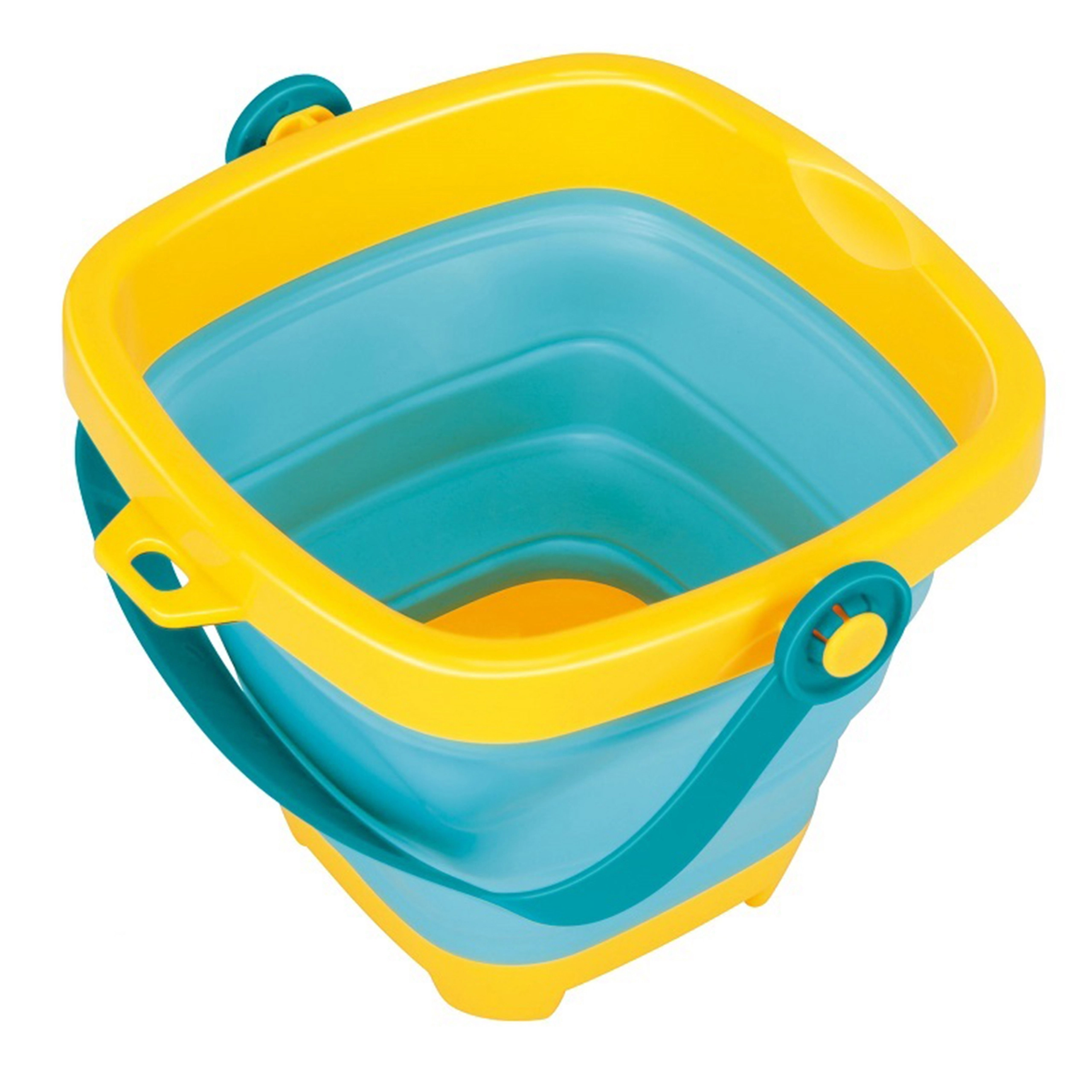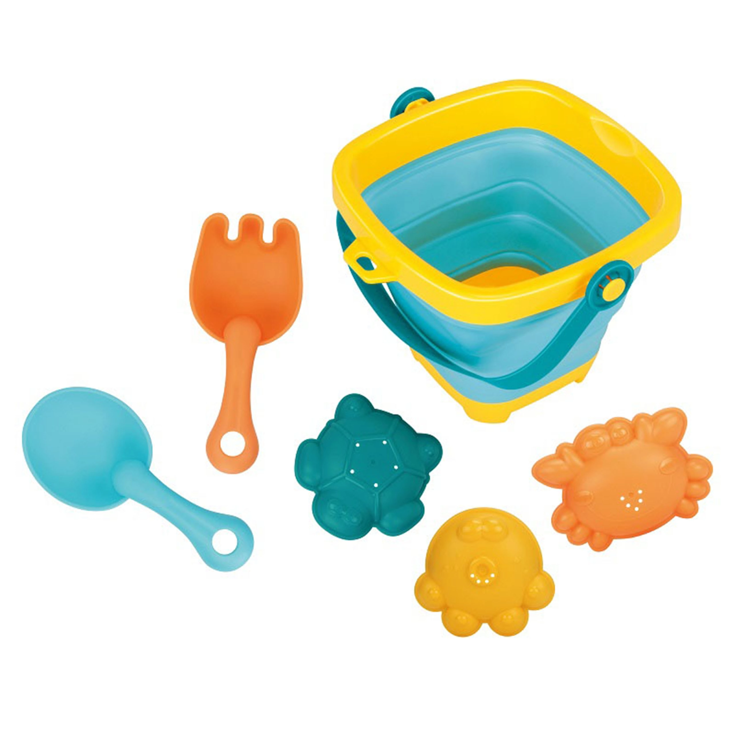 Praktisks smilšu un pludmales komplekts bērniem no 12 mēnešu vecuma: saliekams silikona spainis ar plastmasas malu un rokturi, lāpstiņa, grābeklis un trīs formiņas. Pateicoties harmonikas salocīšanai spainis taupa vietu, ir viegls pārnēsāšanai un ideāli piemērots mugursomai, ratiņiem vai pludmales somai. Izturīgās un elastīgās detaļas ir lieliski piemērotas smilšu kastē, pludmalē un dārzā.