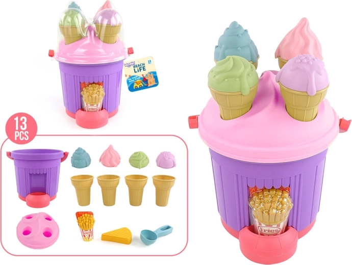Komplekts ir lieliski piemērots dārzam, rotaļlaukumam un jūrai. Spēle “saldējuma veikalā” veicina sociālās prasmes, iztēli un roku–acu koordināciju. Pateicoties spilgtajām krāsām un kvalitatīvam plastikātam, bērni ar to droši spēlēsies visu vasaru.
