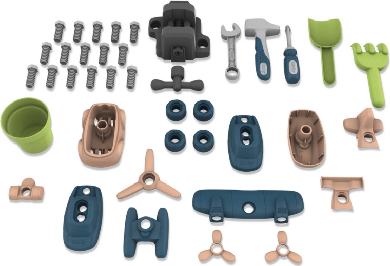 Komplektā ir 39 elementi, tostarp āmuriņš, skrūvgriezis, atslēgas un savienojumelementi. Bērni var paši salikt auto un helikopteru, tā trenējot pacietību, precizitāti un gūstot panākumu sajūtu. Materiāls ir izturīgs, UV stabils un ar augstu pārstrādes īpatsvaru – lieliski piemērots ilgstošai lietošanai dārzā un mājās.