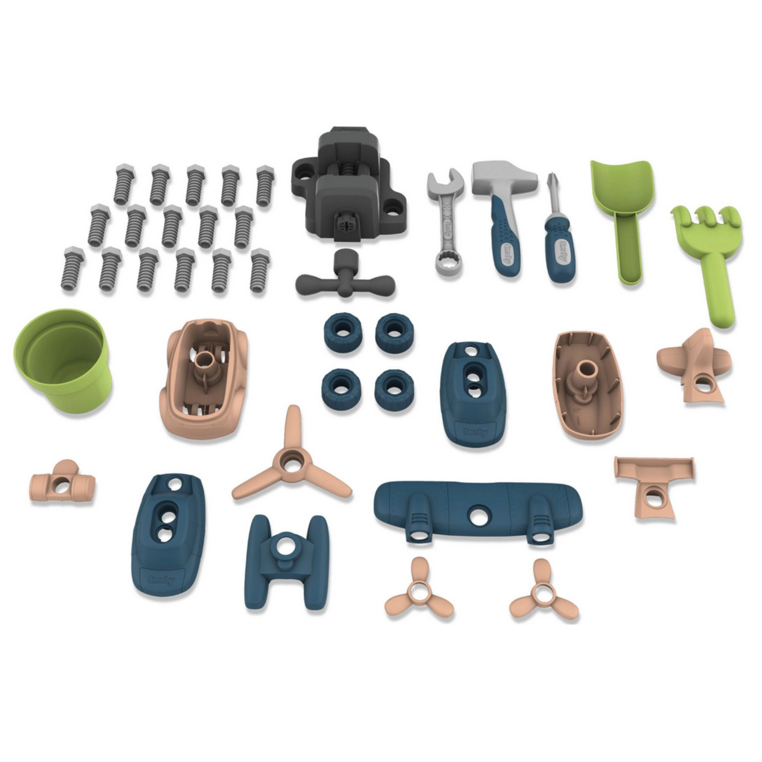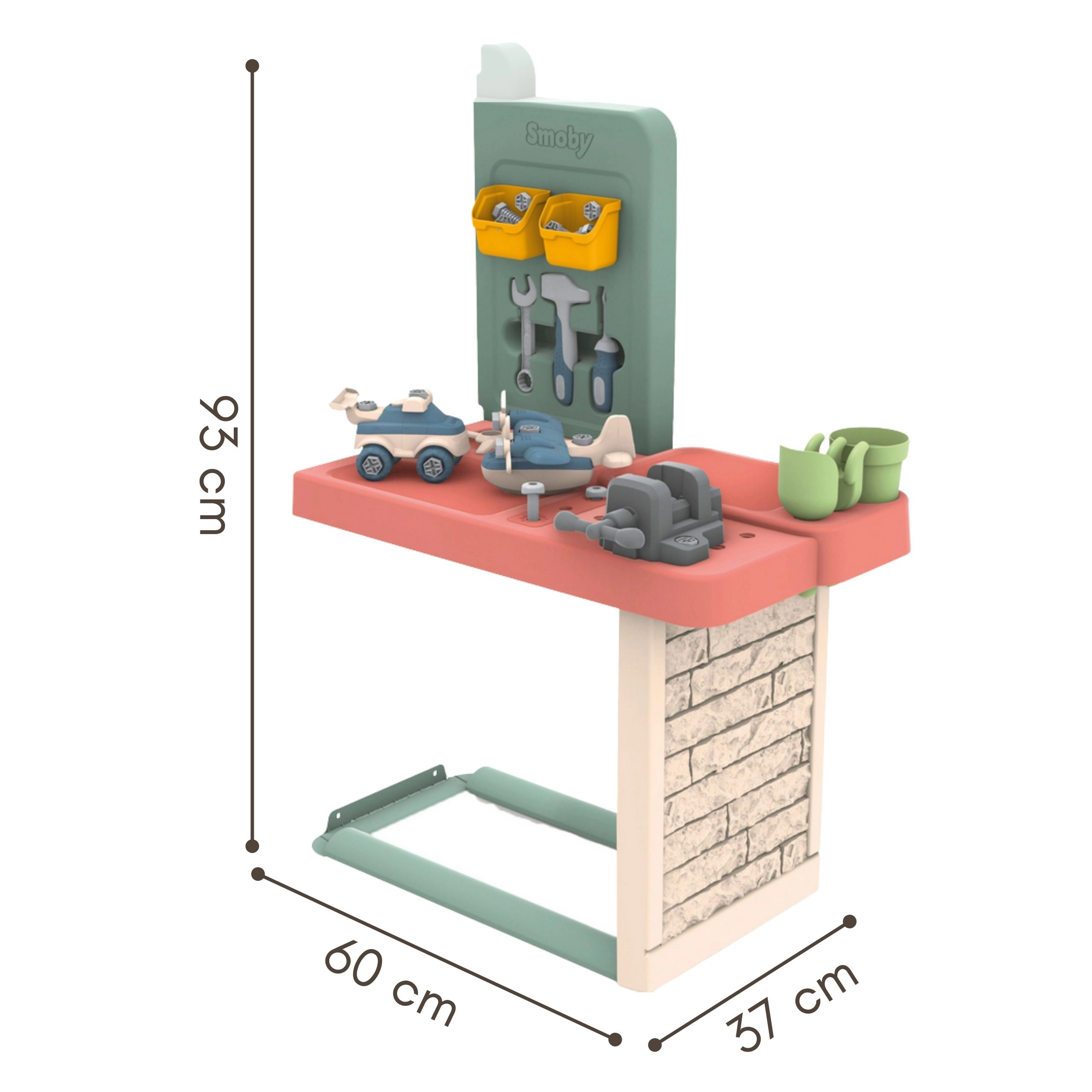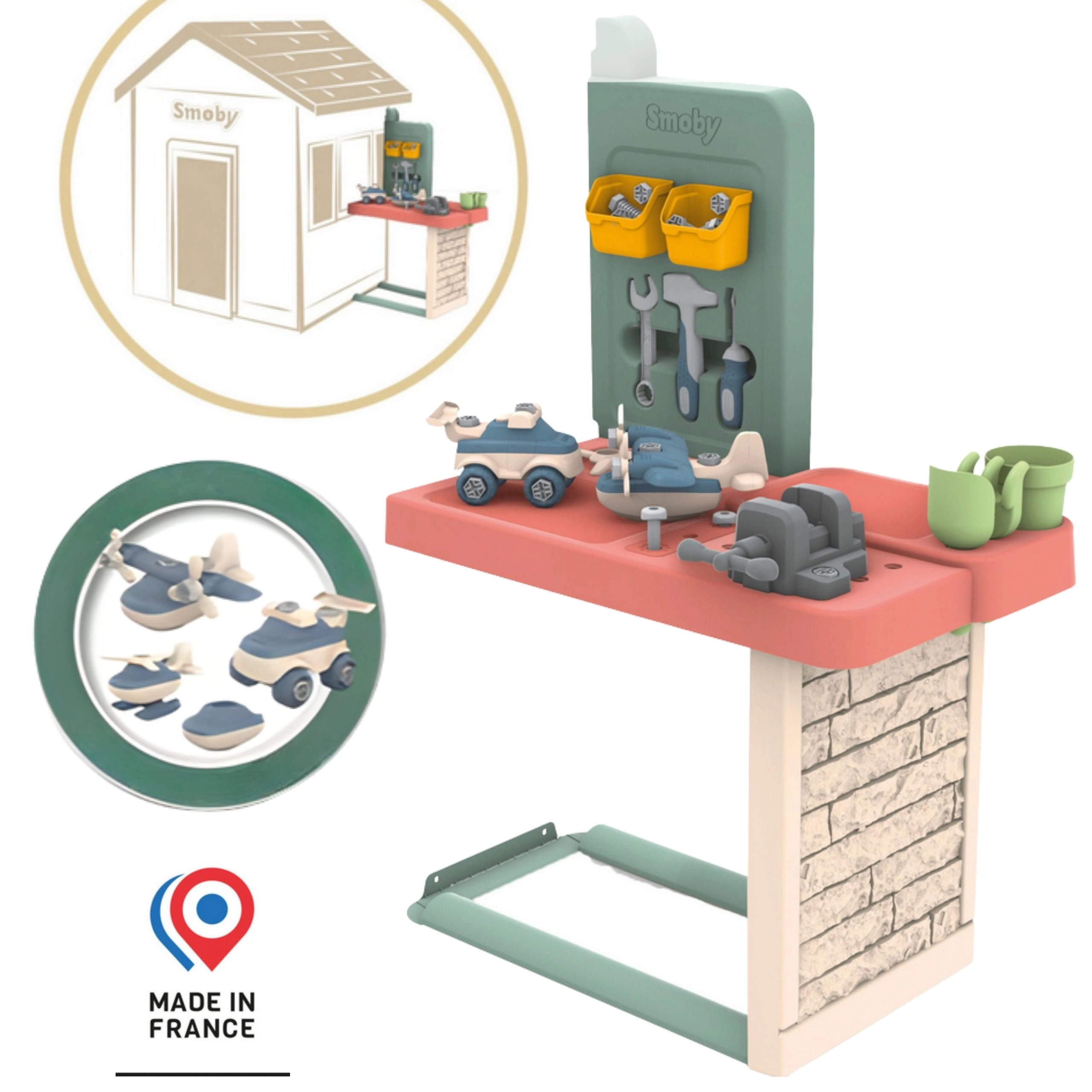 Paplašiniet bērnu mājiņu SMOBY Life ar praktisku darbnīcas komplektu ar pievienojamo galdu un 39 gab. instrumentiem un piederumiem. Mazie meistari no 2 gadu vecuma droši izbaudīs skrūvēšanu, būvēšanu un jaunu prasmju apgūšanu. Neiztrūkst plaša darba virsma, plaukti mantu glabāšanai, kā arī modeļi salikšanai – auto un helikopters. Konstrukcija ir UV izturīga un izgatavota ar augstu pārstrādātu materiālu īpatsvaru ilgstošai izklaidei gan ārā, gan telpās.