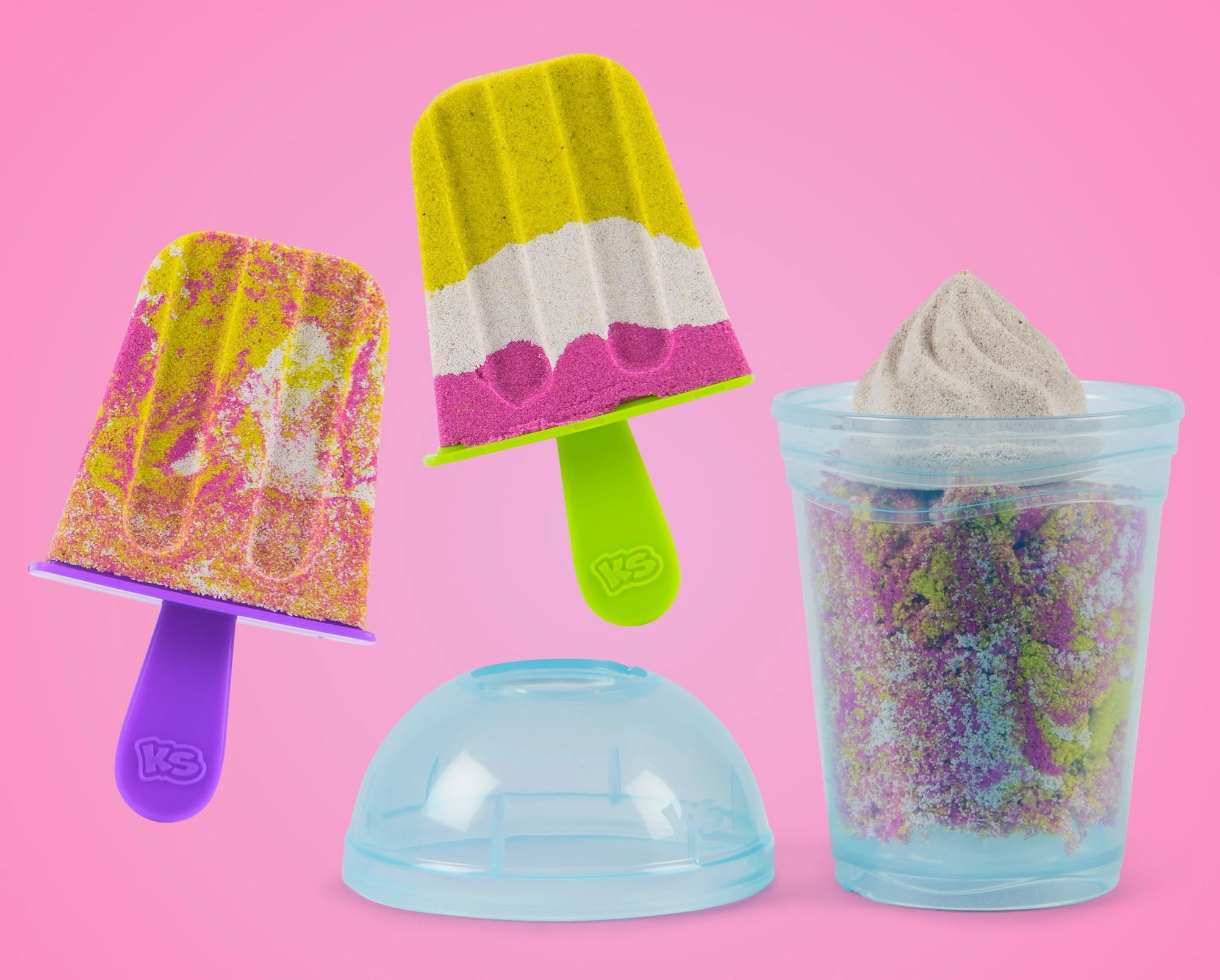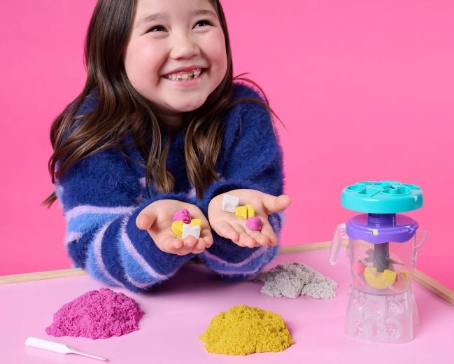 Ar Kinetic Sand smoothie mikseri bērni apgūst krāsu jaukšanu un “dzērienu” un “desertu” slāņošanu glāzītēs vai saldējuma formiņās. Pietiek iebert smiltis miksera vākā, ar roku pagriezt un vērot, kā rodas jaunas nokrāsas un reālistiskas tekstūras. Kinētiskās smiltis šķiet mitras, taču rokas paliek sausas un darba virsma – tīrāka.