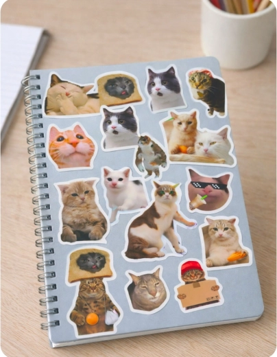 Mīlat kaķus un humoru? Šis universālais dekoratīvo uzlīmju komplekts ar mēmu kaķiem pārvērtīs jebkuru priekšmetu par oriģinālu. Dažādo dizainu dēļ varēsiet veidot unikālas kompozīcijas uz piezīmju kladēm, dienasgrāmatām, telefoniem vai dāvanām. Spīdīgais foto pārklājums izceļas gan uz gaišām, gan tumšām virsmām.
