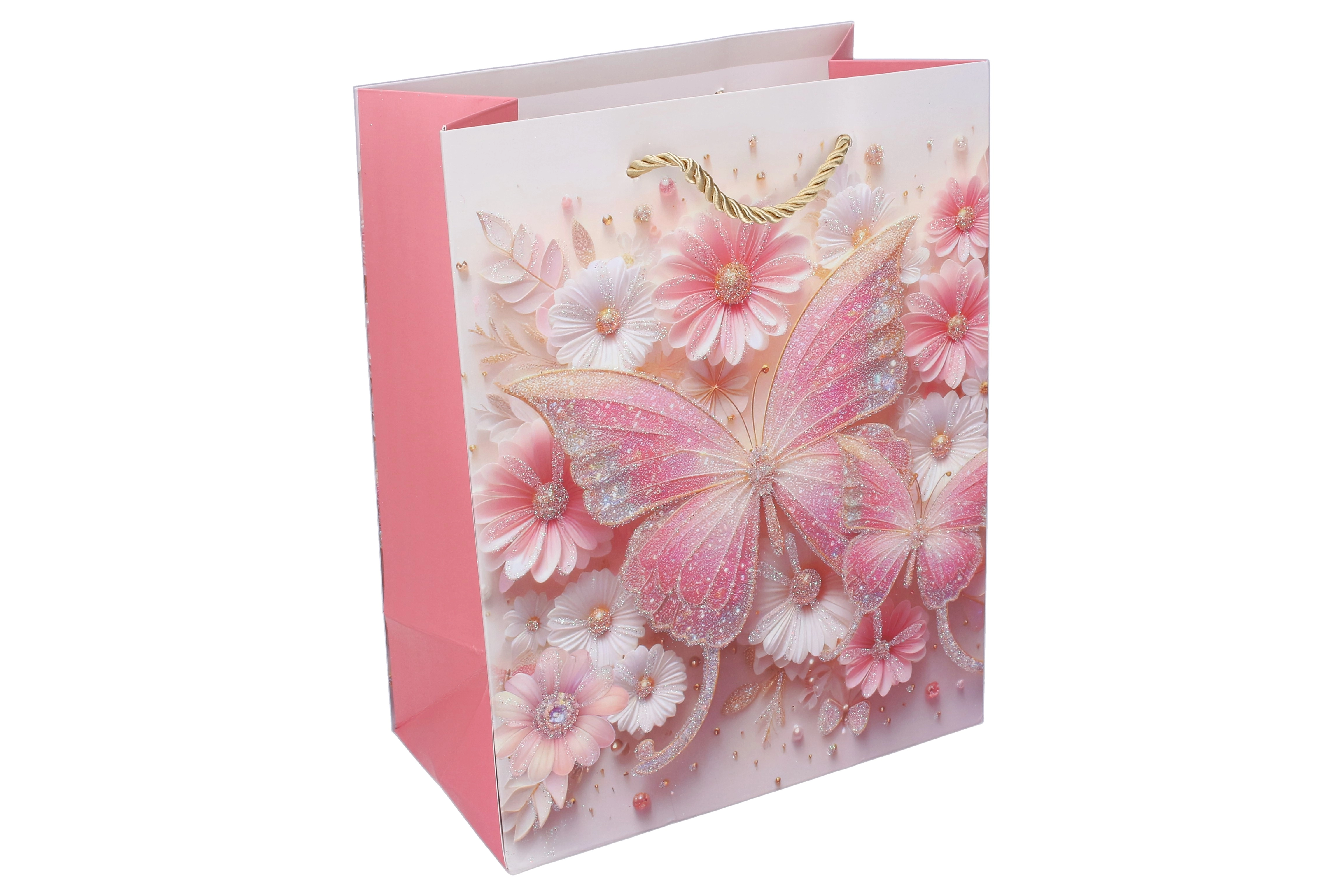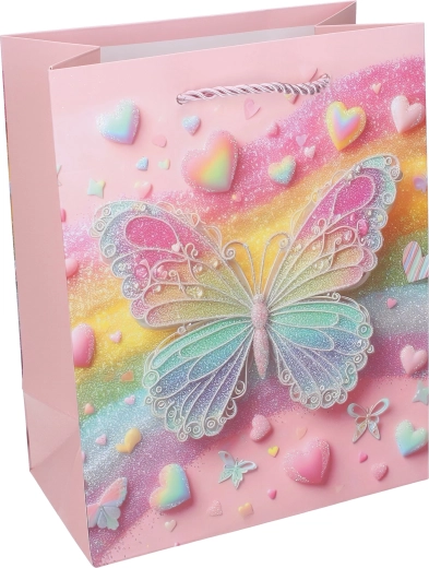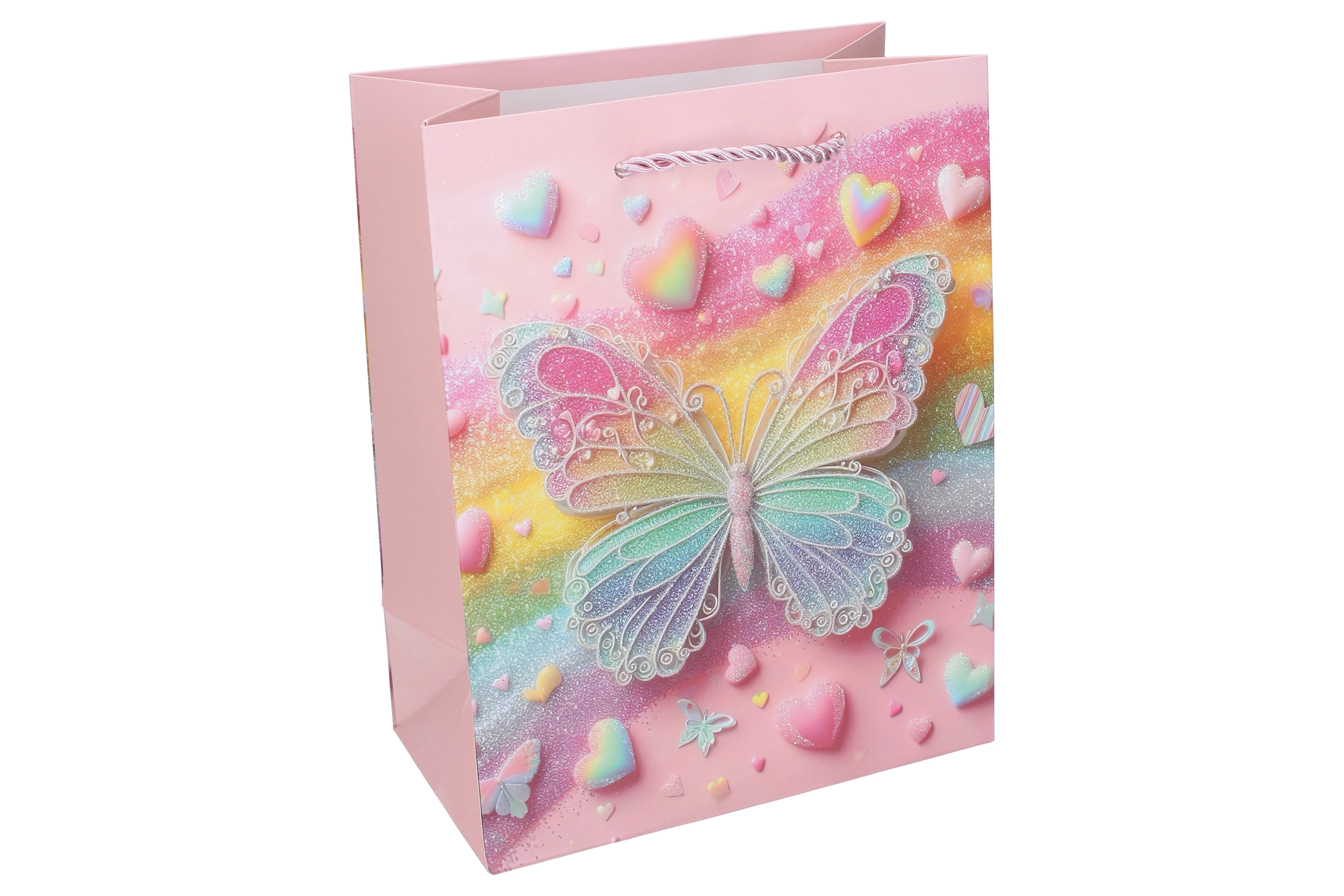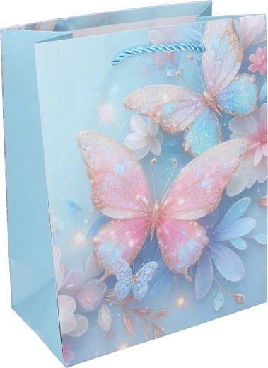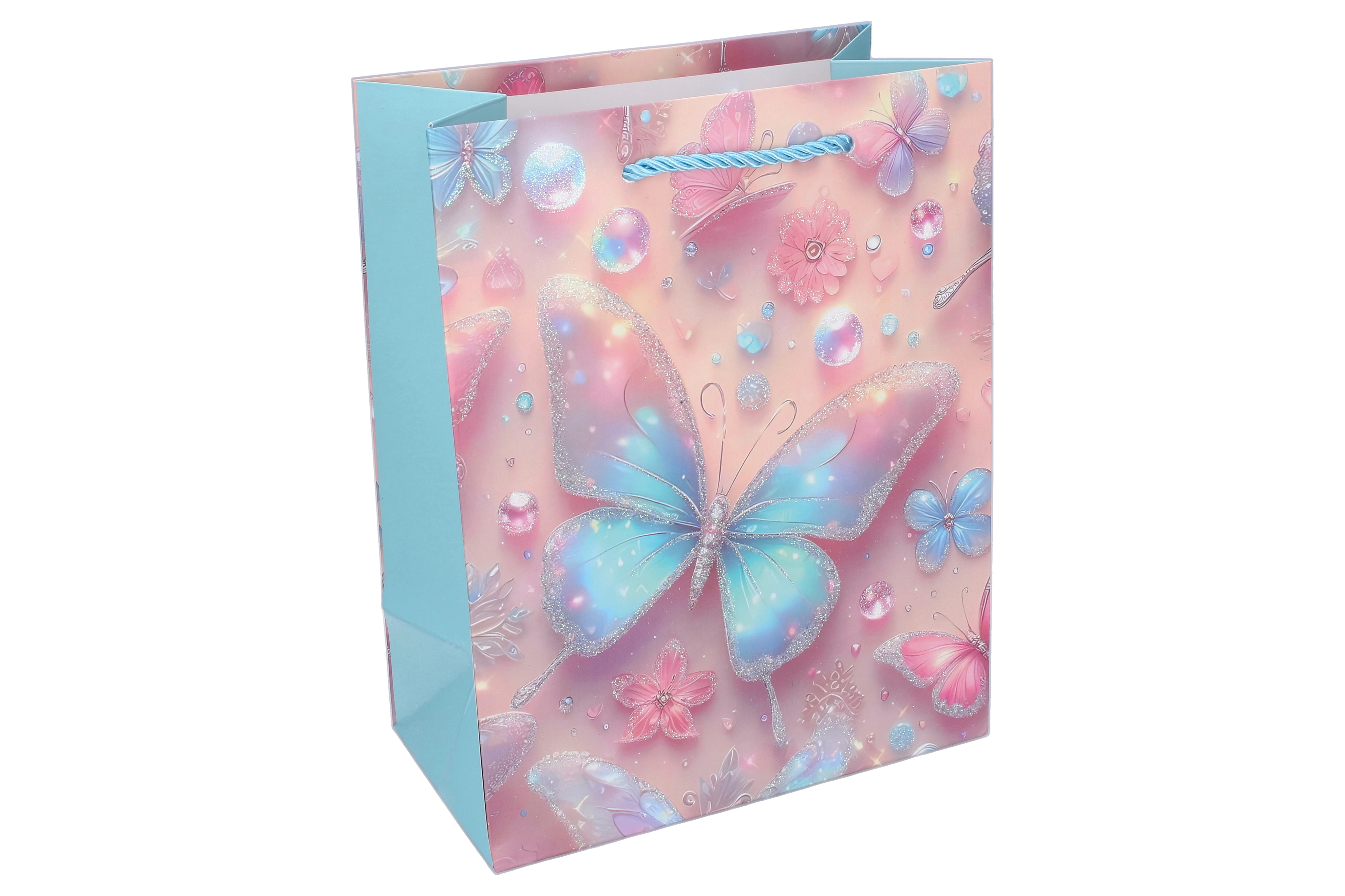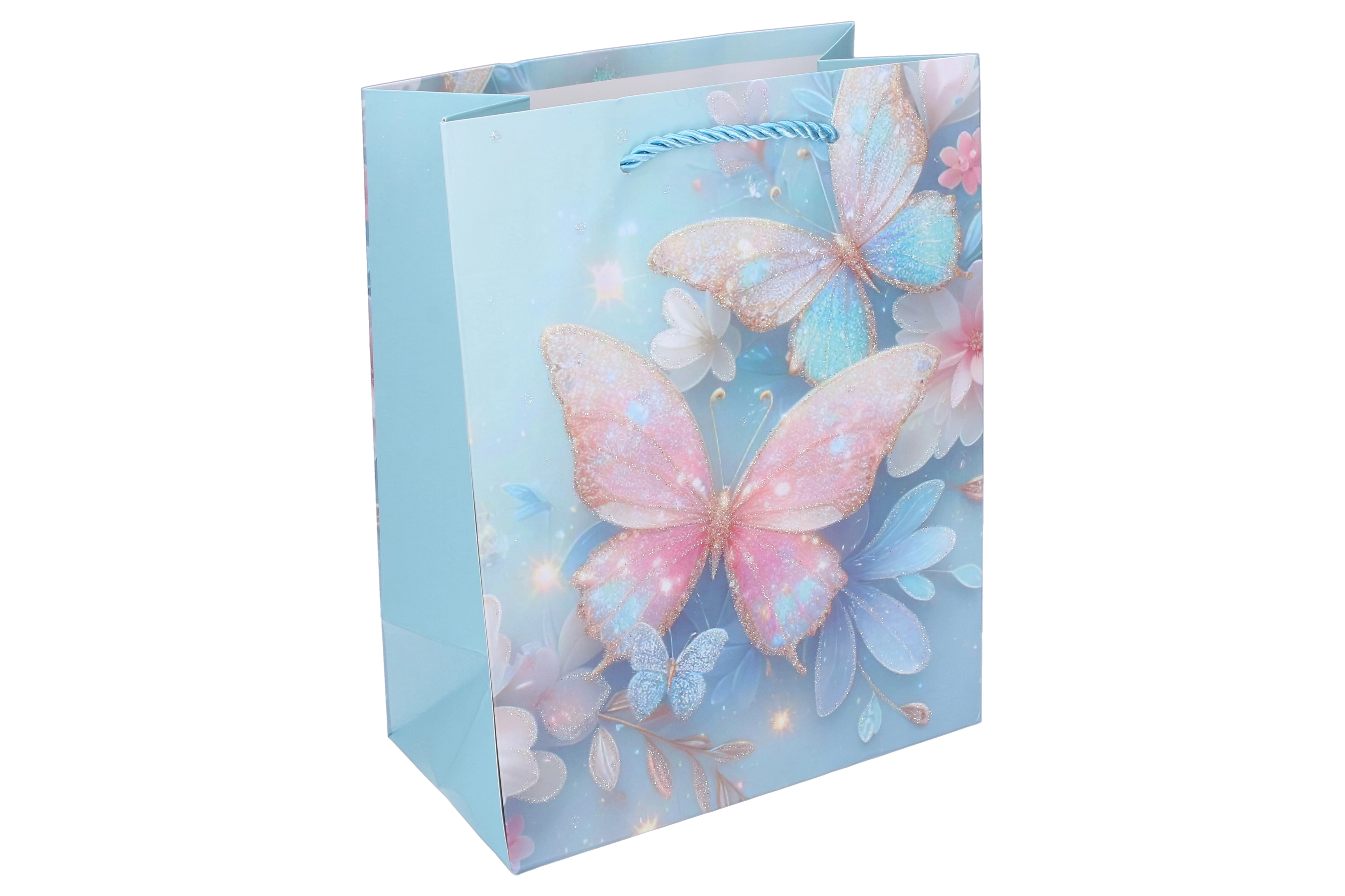 Pateicoties izturīgai papīra konstrukcijai, pastiprinātam dibenam un vītinātiem aukliņu rokturiem, maisiņš ir ērts un uzticams pārnēsāšanai. Spīdīgie un mirdzošie akcenti uz tauriņiem piešķir dāvanai izcilu izskatu, kas iepriecinās gan mazos gaviļniekus, gan viņu vecākus.