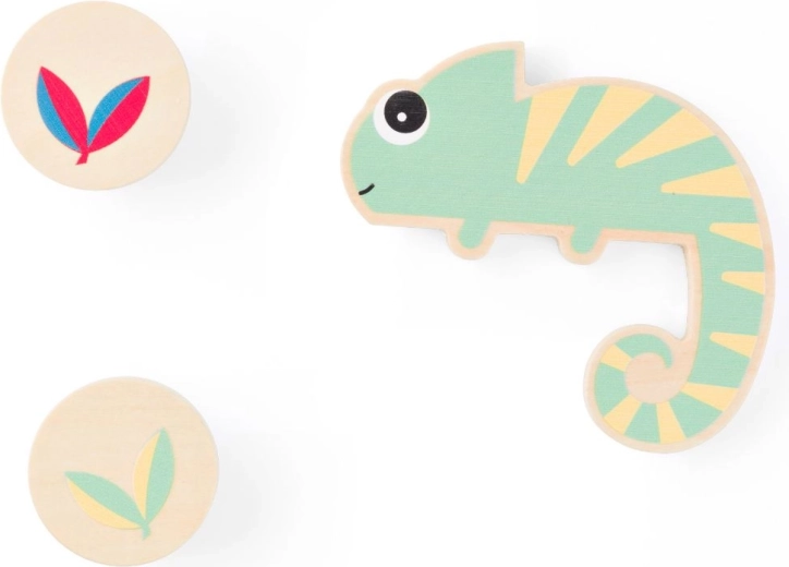 Koka apaļie lapu žetoni rosina bērnus salīdzināt un domāt loģiski: meklējiet lapu ar divām krāsām, kuras hameleonam nav.