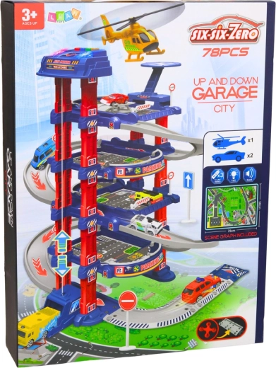 - daudzstāvu autostāvvieta, elektriskais lifts, nobrauciena trase, grīdas paklājs, 2 metāla mašīnītes, helikopters, 7 ceļa zīmes, uzlīmes, ilustrēta instrukcija, oriģinālais iepakojums