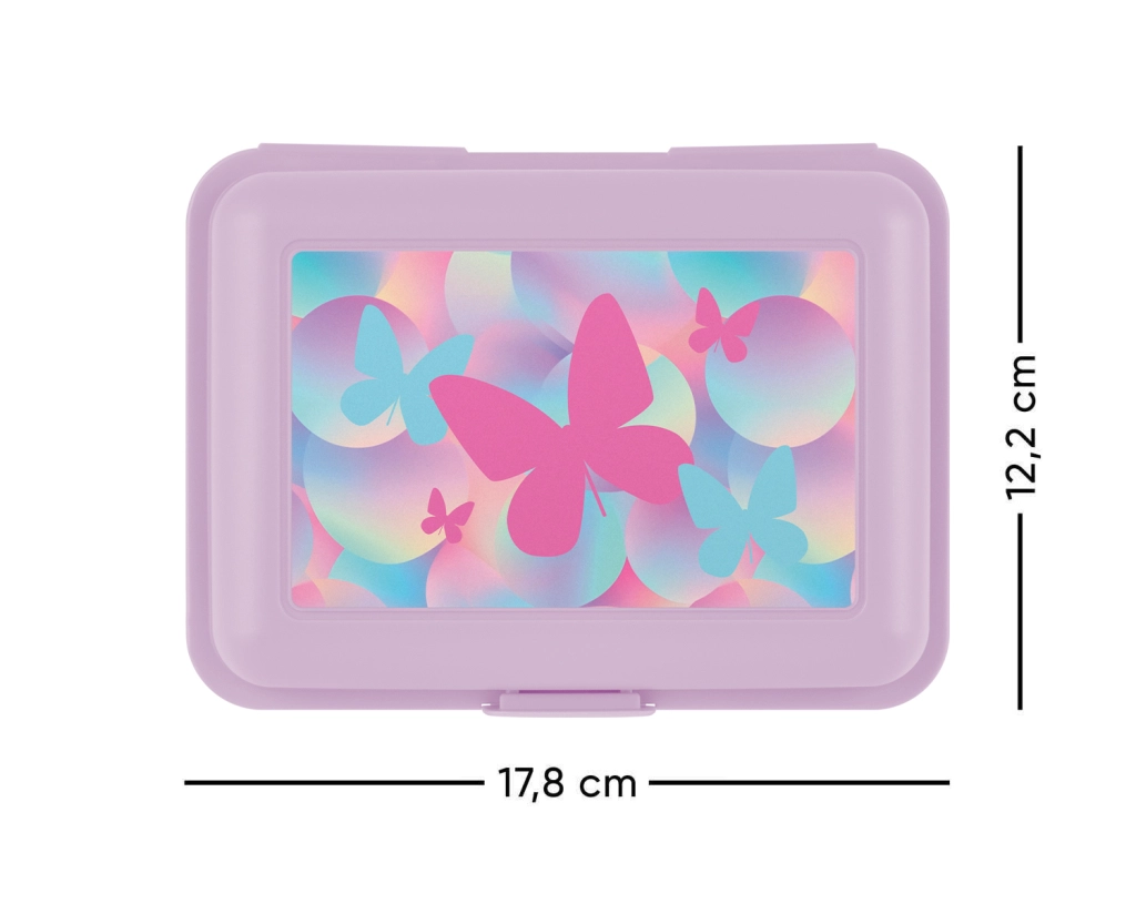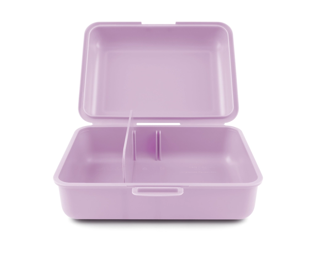 Iekšējais sadalītājs ļauj atsevišķi ievietot augļus, maizītes vai dārzeņus, lai uzkodu daļas nesajauktos. Kastīte ir viegla, kompakta un ērti ievietojama skolas somā vai mugursomā.