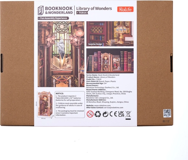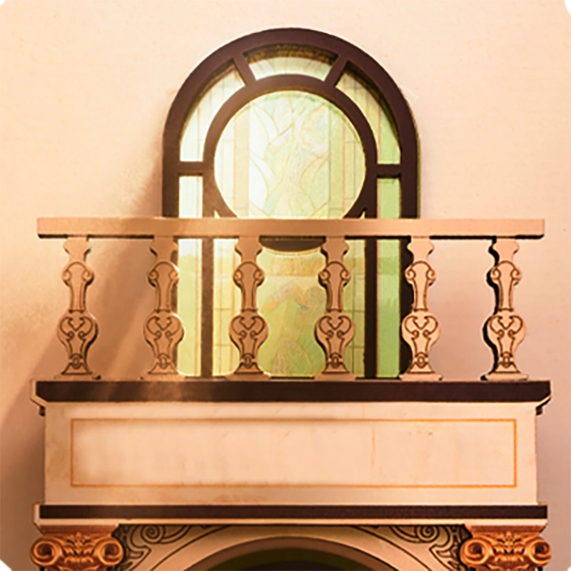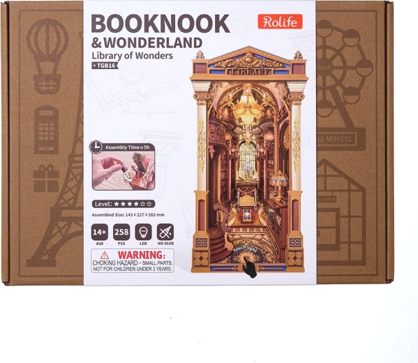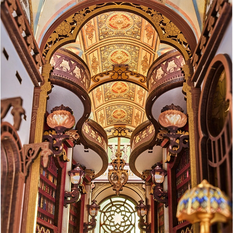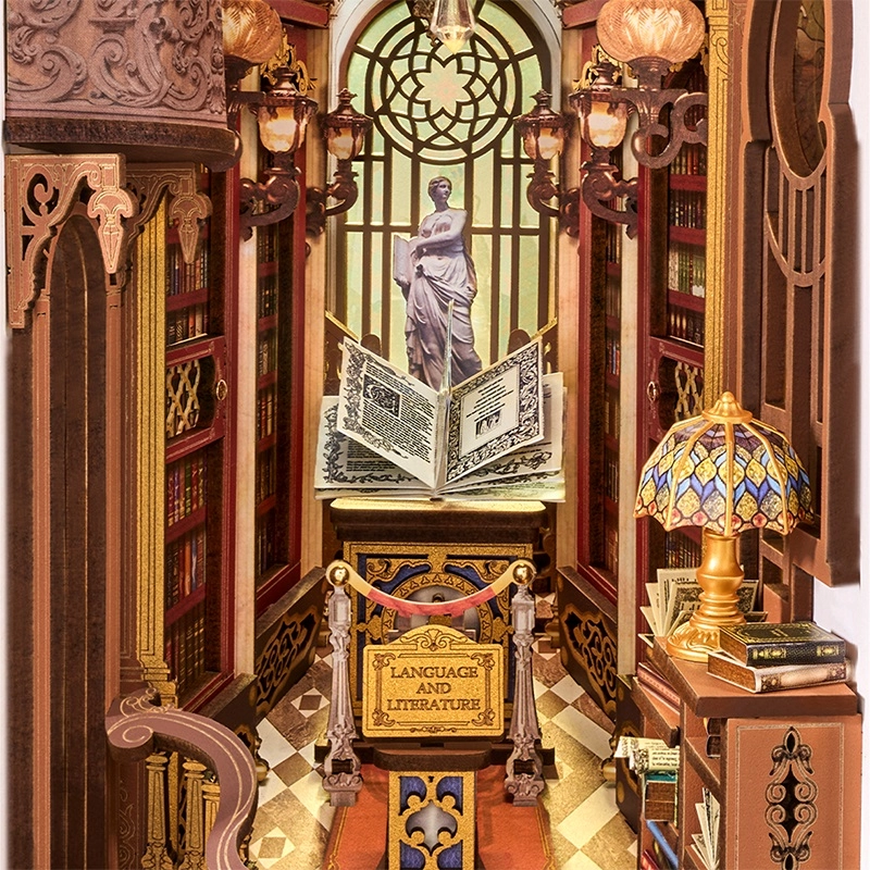Šis iespaidīgais book nook apvieno viktoriāņu arhitektūru, romiešu kolonnas, balkonus un vitrāžu logus miniatūrā skatuvē, kas pilna ar noskaņu. Iekšpusē atradīsiet sarkankoka grāmatu plauktus, velvju arku, mahagona letes virsmu ar atvērtu grāmatu un darbojošos LED lustras apgaismojumu mājīgam noskaņojumam.