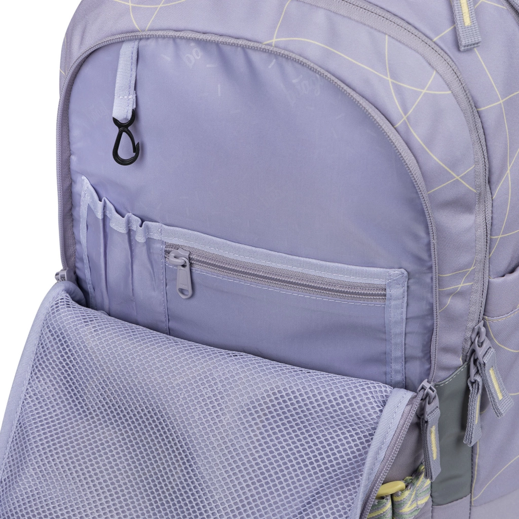 Trīs nodalījumu izkārtojums ar pārskatāmu organizētāju, samtaina kabata klēpjdatoram vai planšetei un praktiski divvirzienu YKK rāvējslēdzēji nodrošina ātru piekļuvi un drošu skolas piederumu un elektronikas glabāšanu. Sānu kabatas no izturīga materiāla ir piemērotas dzeršanas pudeles ievietošanai un saskaņotas ar mugursomas dizainu. Izturīgs, ūdensizturīgs materiāls ar GRS sertifikāciju un izteikti atstarojoši elementi palielina drošību un saudzē dabu.