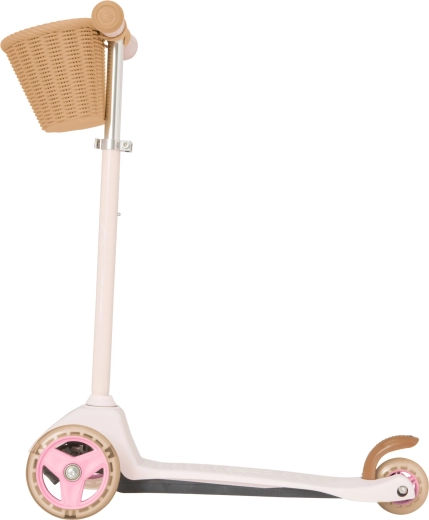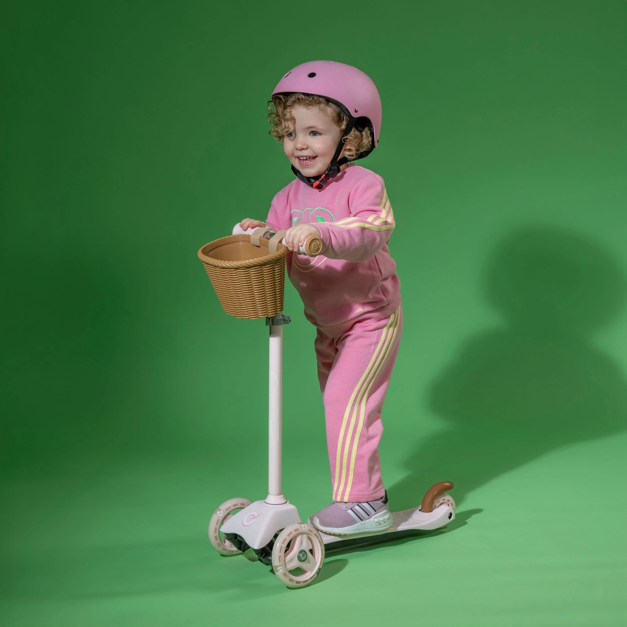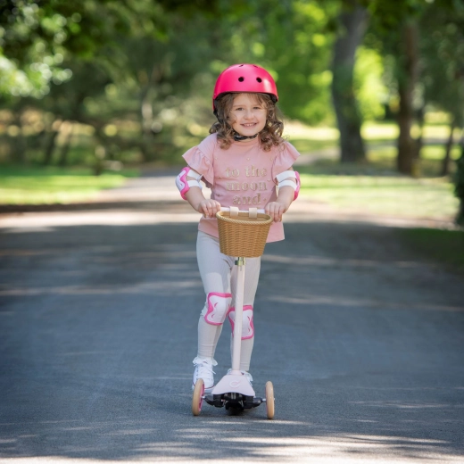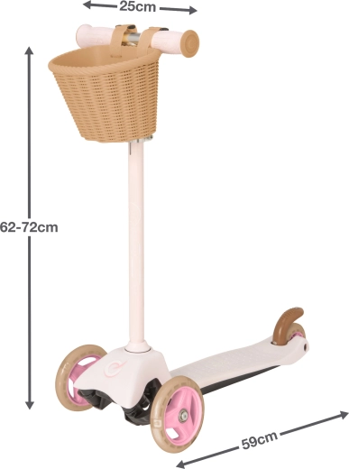 Praktiskais noņemamais groziņš pie stūres ļauj paņemt līdzi iemīļotus sīkumus. Regulējams stūres augstums 62–72 cm un viegla konstrukcija atvieglo vadību un nešanu. Pateicoties pievilcīgajai rozā krāsai, bērni to ātri iemīlēs, bet vecāki novērtēs pārdomātas drošības nianses.