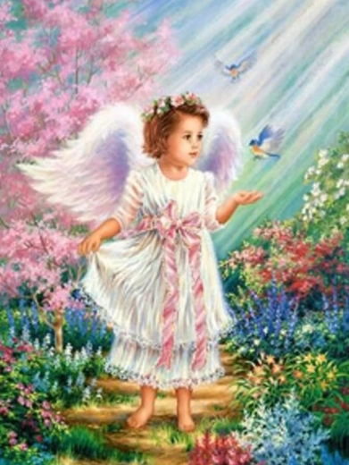 Dimanta krāsošana ir iecienīta relaksācijas tehnika, kurā pakāpeniski līmējat sīkus kristāliņus uz norādītajām vietām uz audekla, veidojot mirdzošu mozaīkas attēlu. Eņģelīša ar putniņiem motīvs izceļas ar smalkām detaļām un spilgtiem atspīdumiem, kas padara gatavo darbu par skaistu dekoru un arī dāvanu.