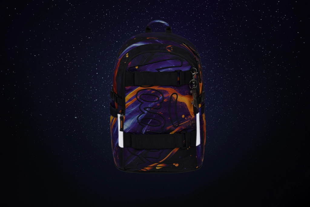 Skolas komplekts Baagl Skate Vibe piedāvā visu, kas skolēniem un studentiem vajadzīgs ikdienai: no ergonomiskas mugursomas ar atstarojošiem elementiem un augstvērtīgiem YKK rāvējslēdzējiem līdz penālim ar dubulto atlokojumu, vieglai saliekamai somai, jostas somai un praktiskam organizatoram/vāciņam. Mūsdienīgs dizains ar izteiktu rakstu violetos, zilajos un oranžajos toņos izcelsies gan skolā, gan ceļā.