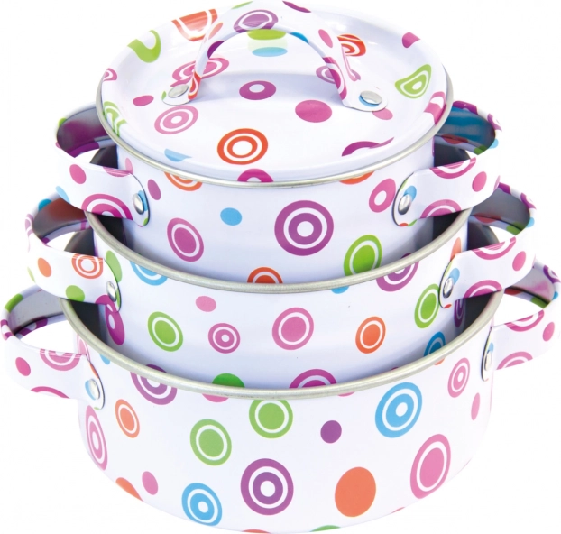 Šis kvalitatīvais emaljēto bērnu trauku komplekts ir ideāli piemērots spēlei “pavāri” un mazajām saimniecēm. Metāla katli, panna un piederumi izskatās autentiski, tāpēc bērni izbaudīs reālistisku gatavošanu un servēšanu. Krāsainie punktiņi uz baltā fona piešķir komplektam priecīgu izskatu, kas atdzīvinās jebkuru bērnu stūrīti.