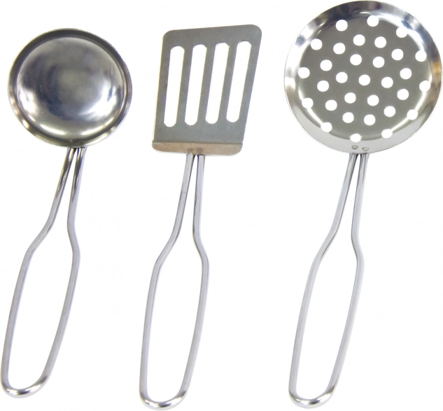 Katli, panna un piederumi no metāla izskatās kā īsti, tāpēc bērni var ar maksimālu ticamību atdarināt gatavošanu un servēšanu.