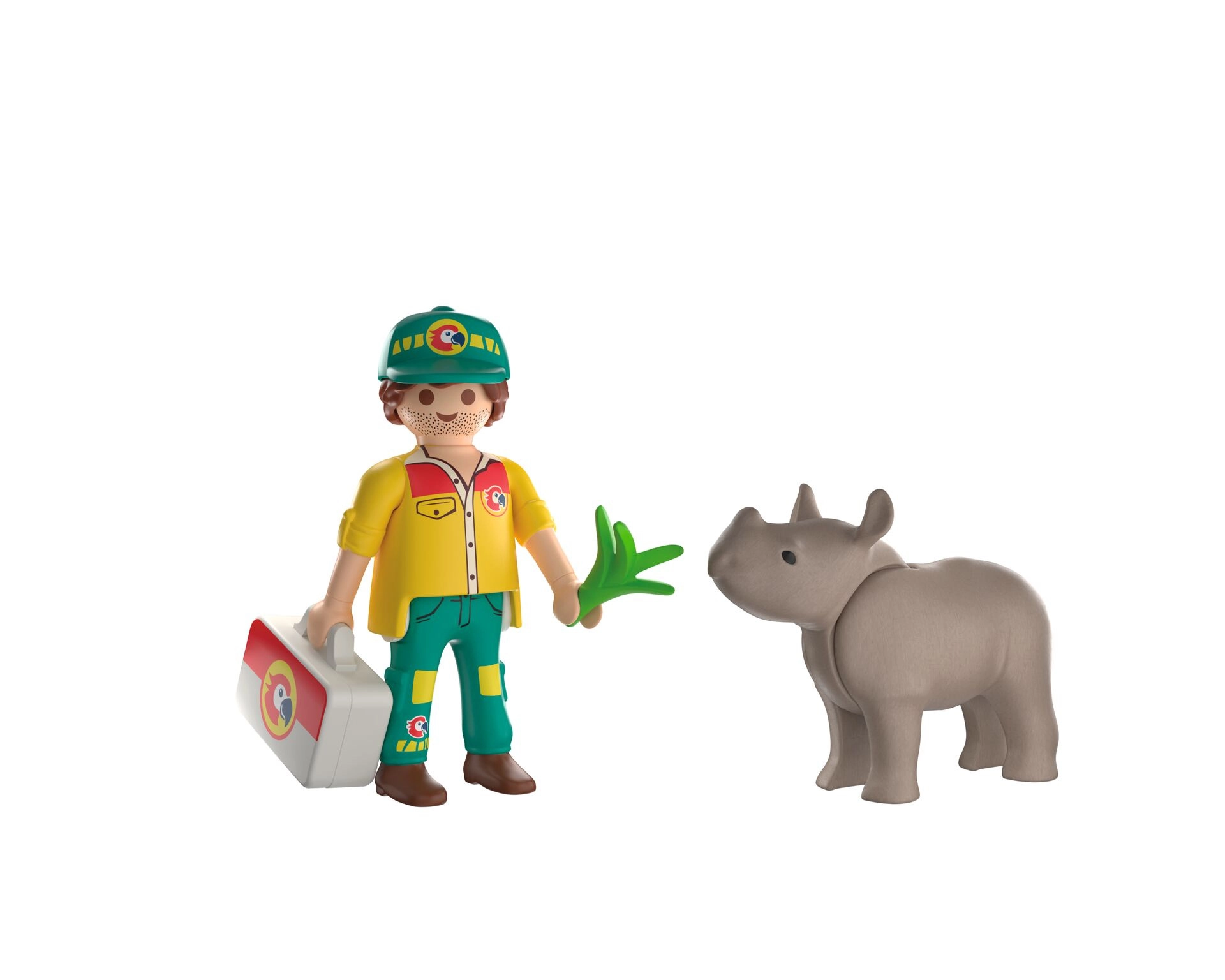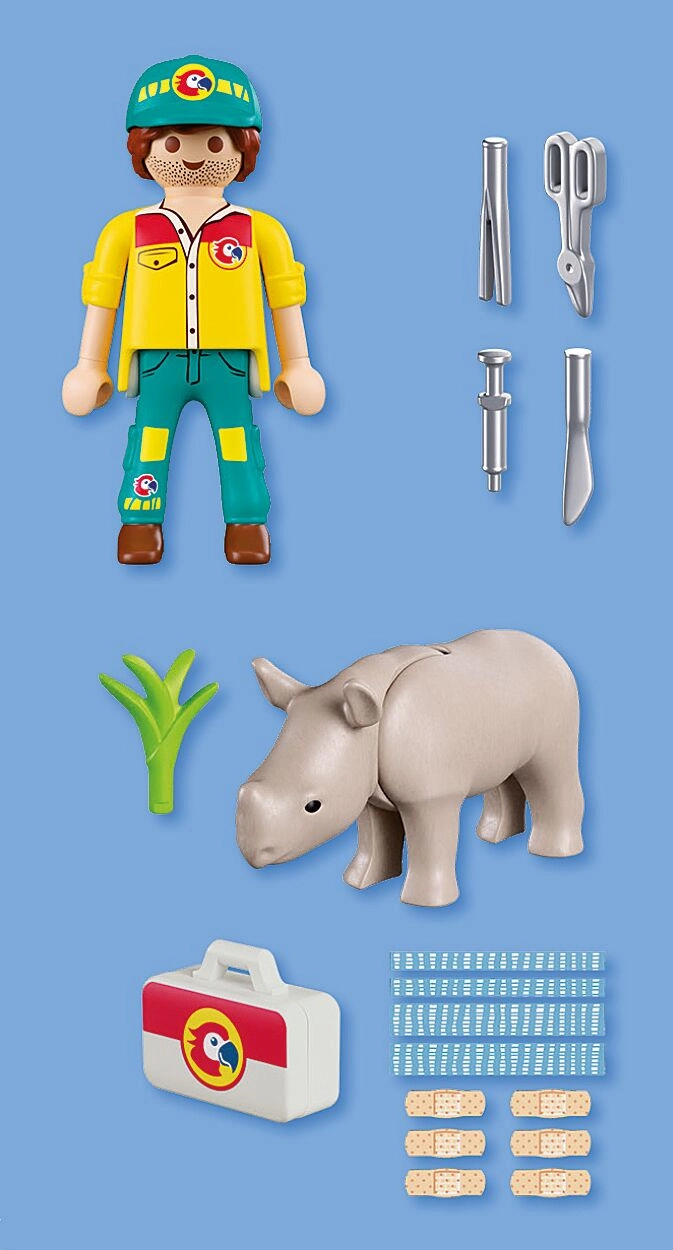 Ienāciet PLAYMOBIL pasaulē un palīdziet ievainotajam degunradzim atkal nostāties uz kājām. Šis Duo Pack sērijas komplekts piedāvā divas detalizētas figūriņas un praktisku piederumu klāstu, ar kuriem bērni var izspēlēt neskaitāmus stāstus no Playmo-City zoodārza. Reālistiskie instrumenti un aprīkojums attīsta iztēli un rūpes par dzīvniekiem.