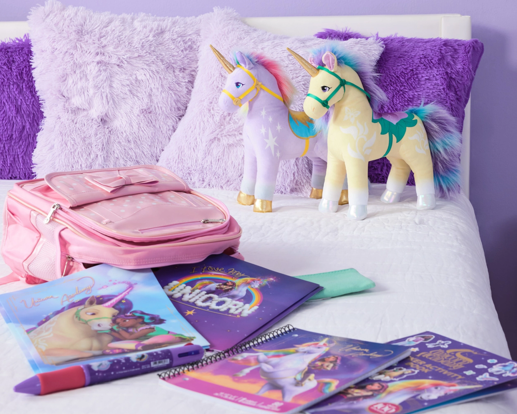 - Unicorn Academy dizains: botānisks segliņš un iemaukti zaļi–violetos toņos, dekoratīvi raksti.