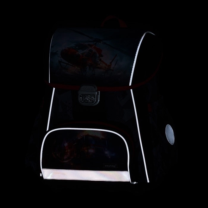 Atstarojošie elementi un drošības metāla sprādze uzlabo redzamību un bērna drošību ceļā uz skolu.