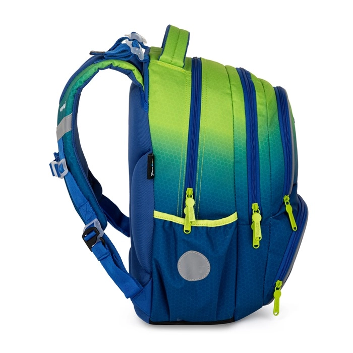 Skolas komplekts OXY NEXT Ombre Green ir izstrādāts bērniem ar augumu no 128 cm. Galvenā zvaigzne ir vieglā skolas mugursoma ar tilpumu 21 l un nestspēju 8 kg, kas, pateicoties anatomiski veidotai aizmugurei un polsterētām, regulējamām lencēm ar krūšu siksnu, nodrošina komfortu un veselīgu slodzes sadalījumu. Atstarojošie elementi uzlabo redzamību krēslā un lietū, savukārt pastiprinātais necaurlaidīgais dibens aizsargā saturu no mitruma.