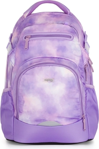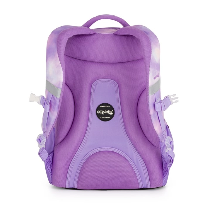 Skolas mugursoma OXY Ombre Butterfly mūsdienīgā violetā tie-dye dizainā apvieno stilu, komfortu un pārdomātu organizāciju. Pateicoties ergonomiskajam muguras panelim un polsterētām, regulējamām plecu lencēm, tā ērti pieguļ arī pie pilnas slodzes. Regulējamā krūšu siksna palīdz vienmērīgi sadalīt svaru un notur mugursomu stabilu uz muguras.