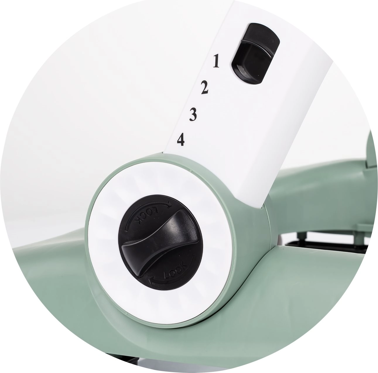 Pret-slīdes paliktņi, drošības atdures, bloķējami riteņi un ātruma regulēšana. Augstumu var viegli pielāgot bērna augumam.
