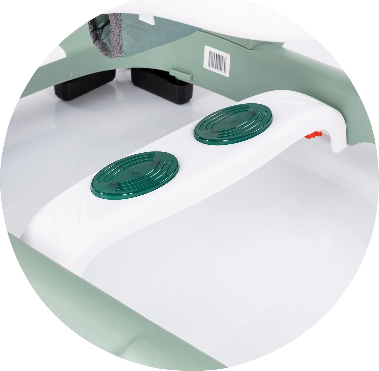 Krāsainas pogas, gaismas efekti un kustīgas rotaļlietas attīsta maņas un sīko motoriku, uzturot bērnu aizrautu visas dienas garumā.