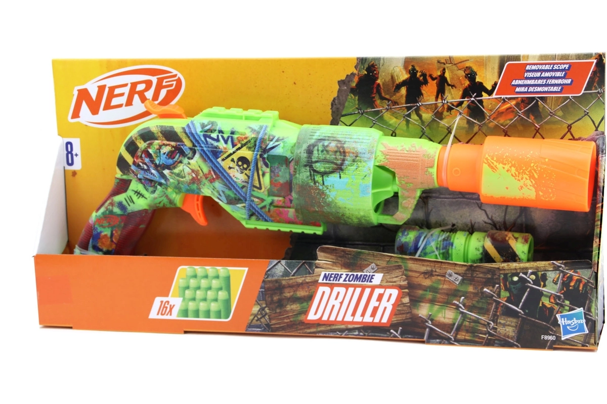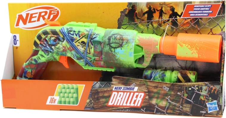 Nerf Zombie Driller blasteris piedāvā unikālu izskatu, iedvesmotu no zombiju pasaules – tas izskatās kā pārveidots urbis, gatavs cīņai. Pievilcīgā grafiti apdruka un jautrās detaļas padara to par ideālu papildinājumu tematiskām spēlēm, ballītēm un dinamiskām cīņām ar draugiem. Noņemamais tēmēklis palīdz precīzāk trāpīt, un 16 šautriņas komplektā nodrošina daudz jautrības.