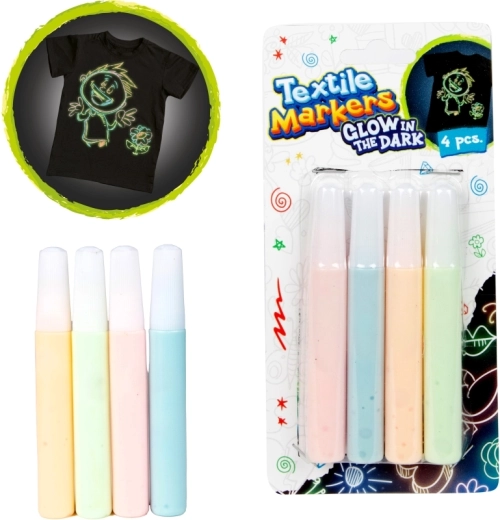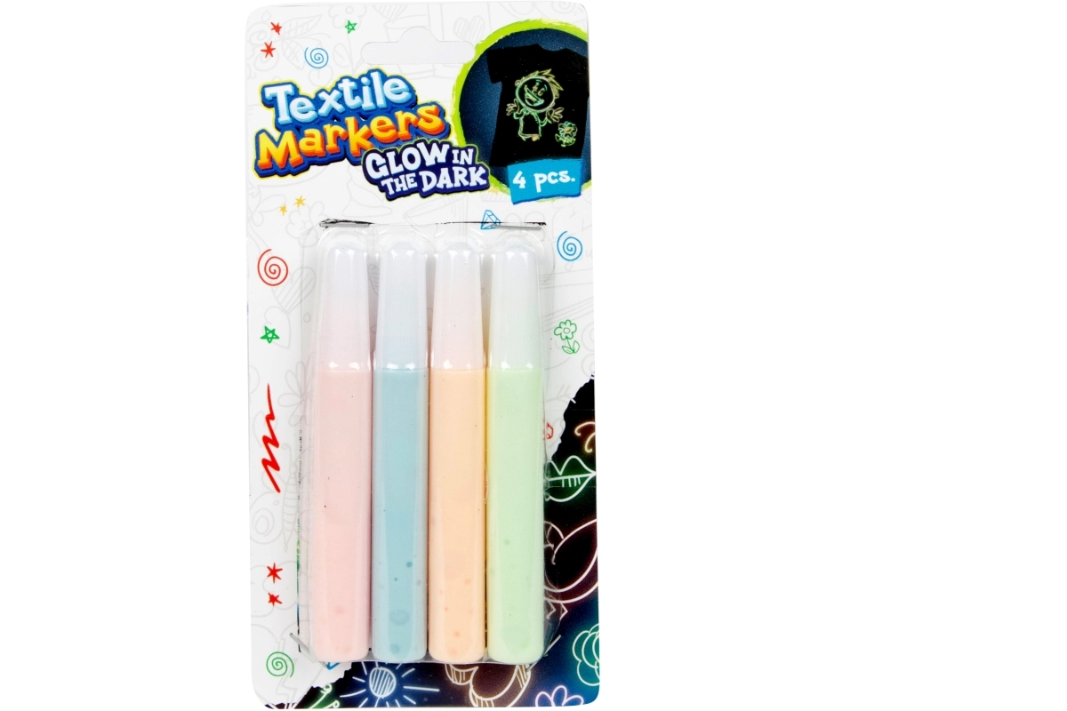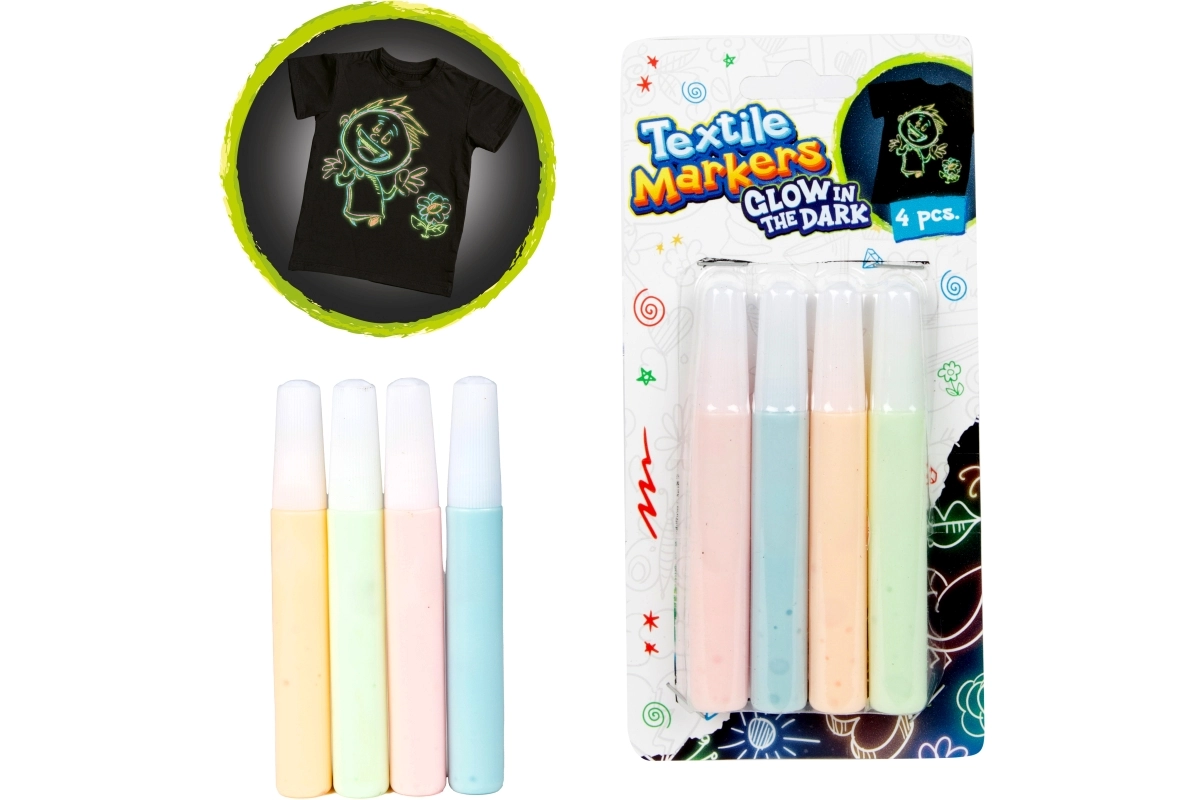 Izveidojiet oriģinālu T-kreklu, somu un cita tekstila dizainu ar šo četru tekstila flomāsteru komplektu, kuri spīd tumsā. Pasteļ/neona toņi viegli klājas un veido košus motīvus, kas ir redzami arī pēc gaismas izslēgšanas. Ideāli radošām aktivitātēm ar bērniem no 3 gadu vecuma un pieaugušo projektiem.