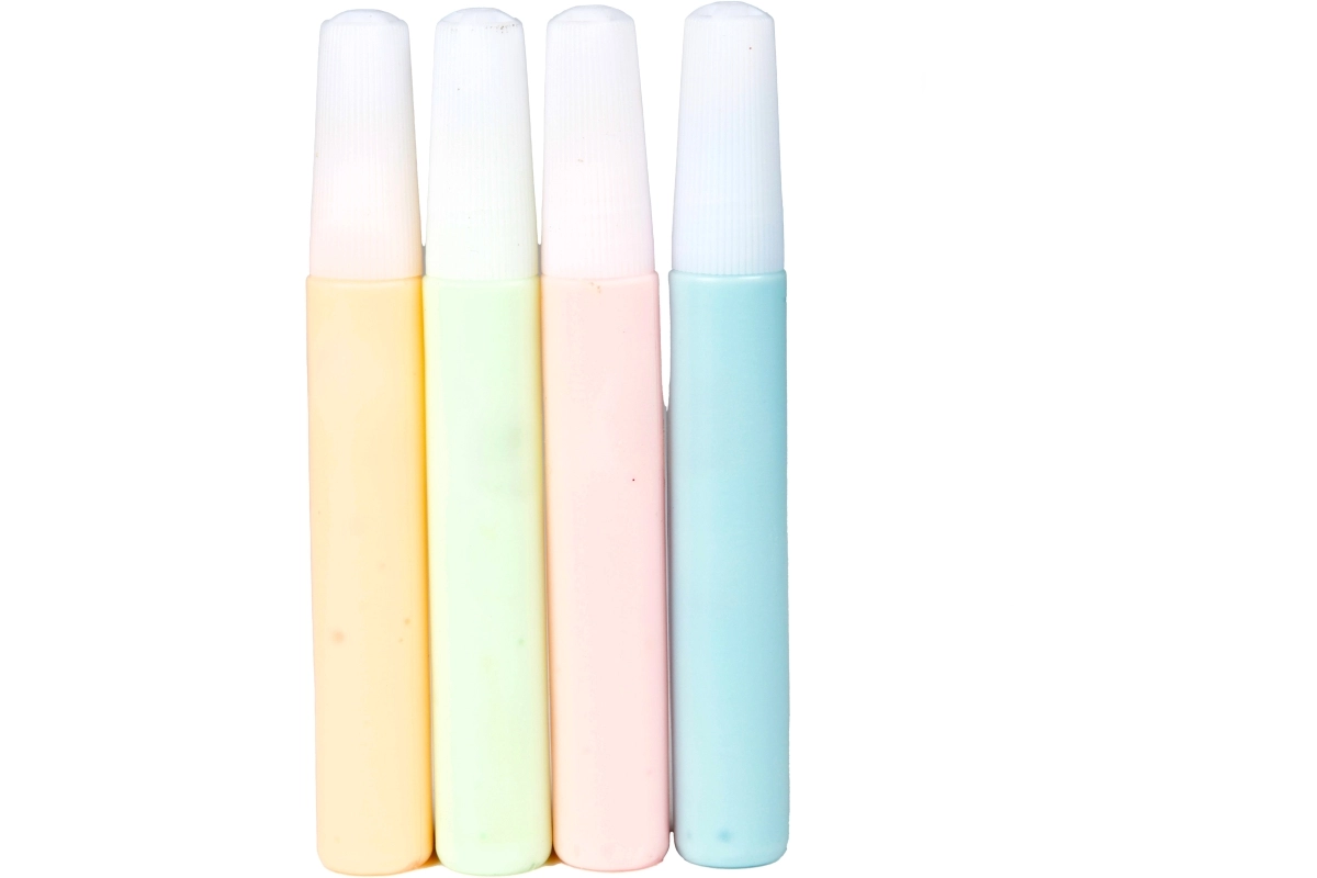 Komplektā ir dzeltena, gaiši zaļa, rozā un gaiši zila krāsa daudzveidīgām un radošām kombinācijām uz tekstila.