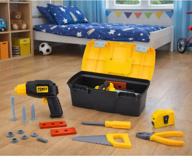 Šis praktiskais bērnu instrumentu komplekts piedāvā visu, kas mazajam meistaram nepieciešams: akumulatora urbjmašīnu, āmuru, zāģi, skrūvgriezi, knaibles, mērlenti, skrūves un konstrukcijas detaļas. Izturīgais skapītis ar rokturi visu glīti tur kopā un atvieglo līdziņemšanu ceļā.