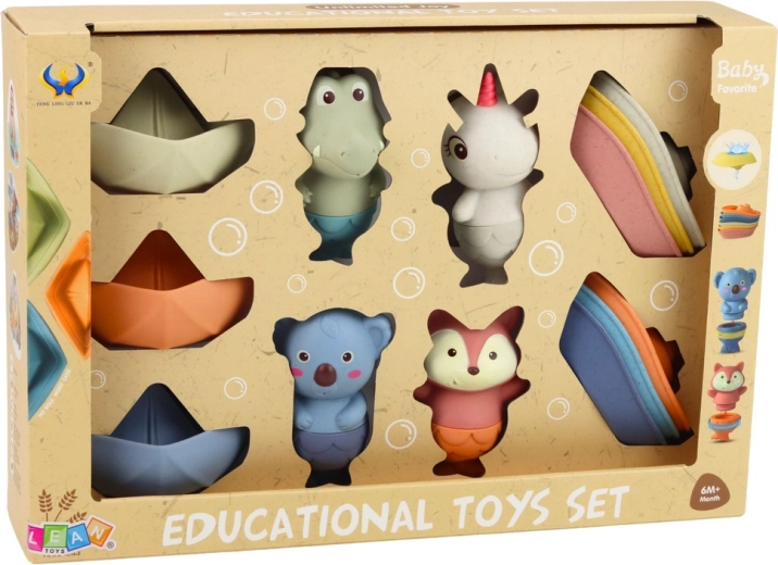 - 4 atvienojami gumijas dzīvnieciņi, 6 plastmasas laiviņas, 3 gumijas kuteri