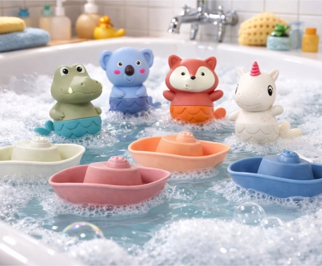 Drošie mīkstie gumijas dzīvnieciņi lieliski pieguļ bērna rociņai, plastmasas laiviņas un gumijas kuteri veicina iztēli ūdens piedzīvojumos vannā, baseinā un vasaras rotaļās ārā.