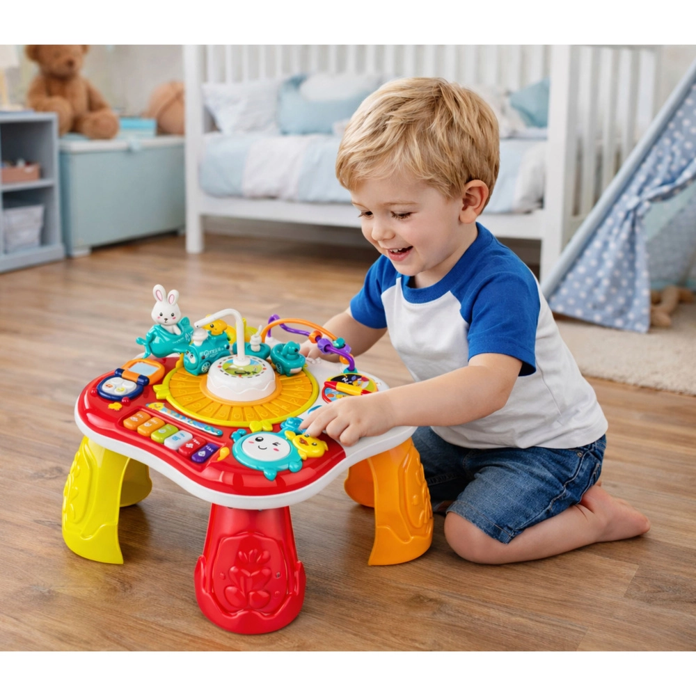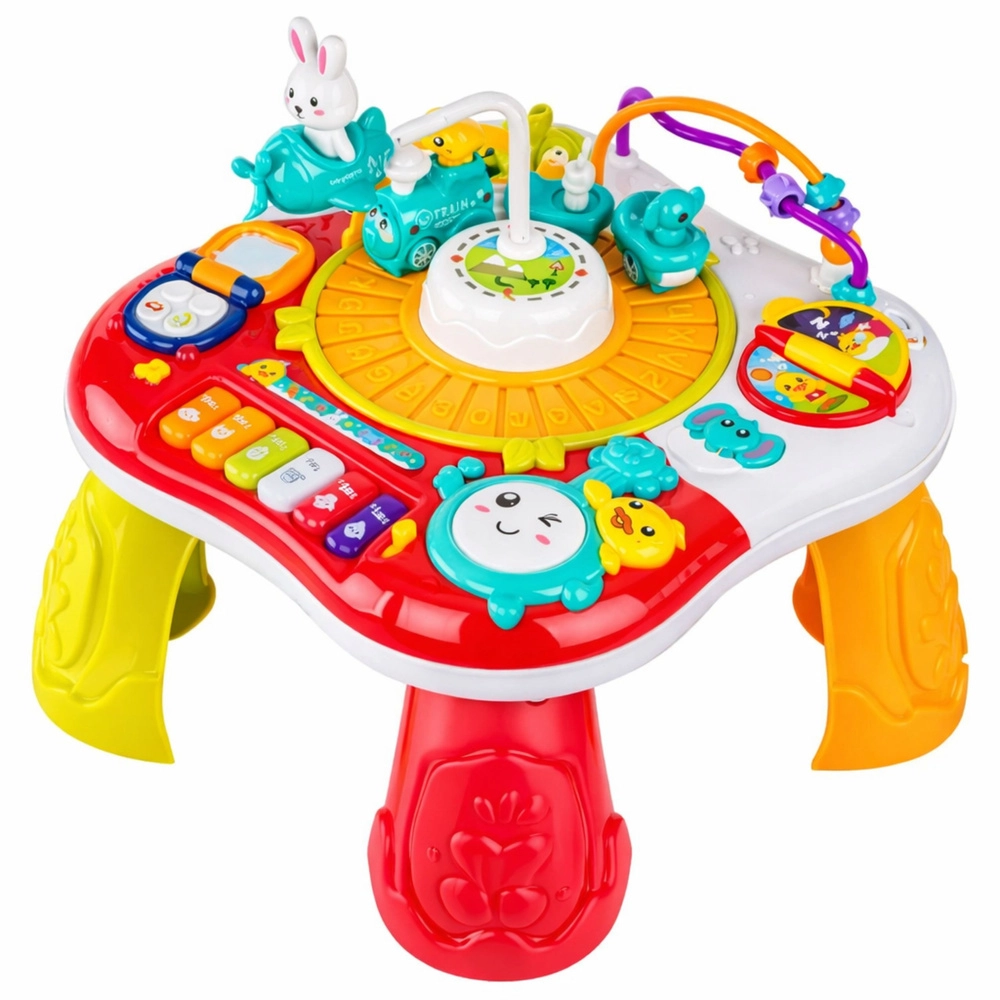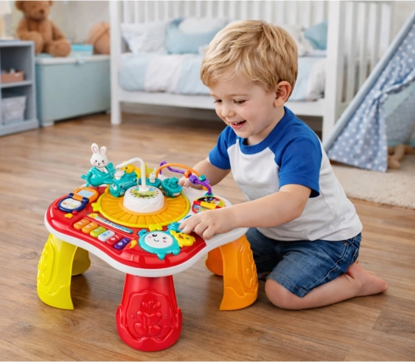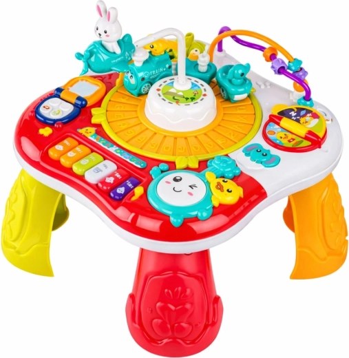 Interaktīvs izglītojošs galds 2 vienā ir lieliska izvēle bērnu maņu un prasmju attīstībai. Tas piedāvā klavierītes ar melodijām, gaismas un skaņas efektus, tālruņa imitāciju, griežamus ratiņus un zobratus, kā arī pārvietojamu trusīti, kas piesaista uzmanību. Pateicoties noņemamām kājām, to var viegli pārvērst par plakanas formas izglītojošu paneli – ideāli dažādiem vecuma posmiem.