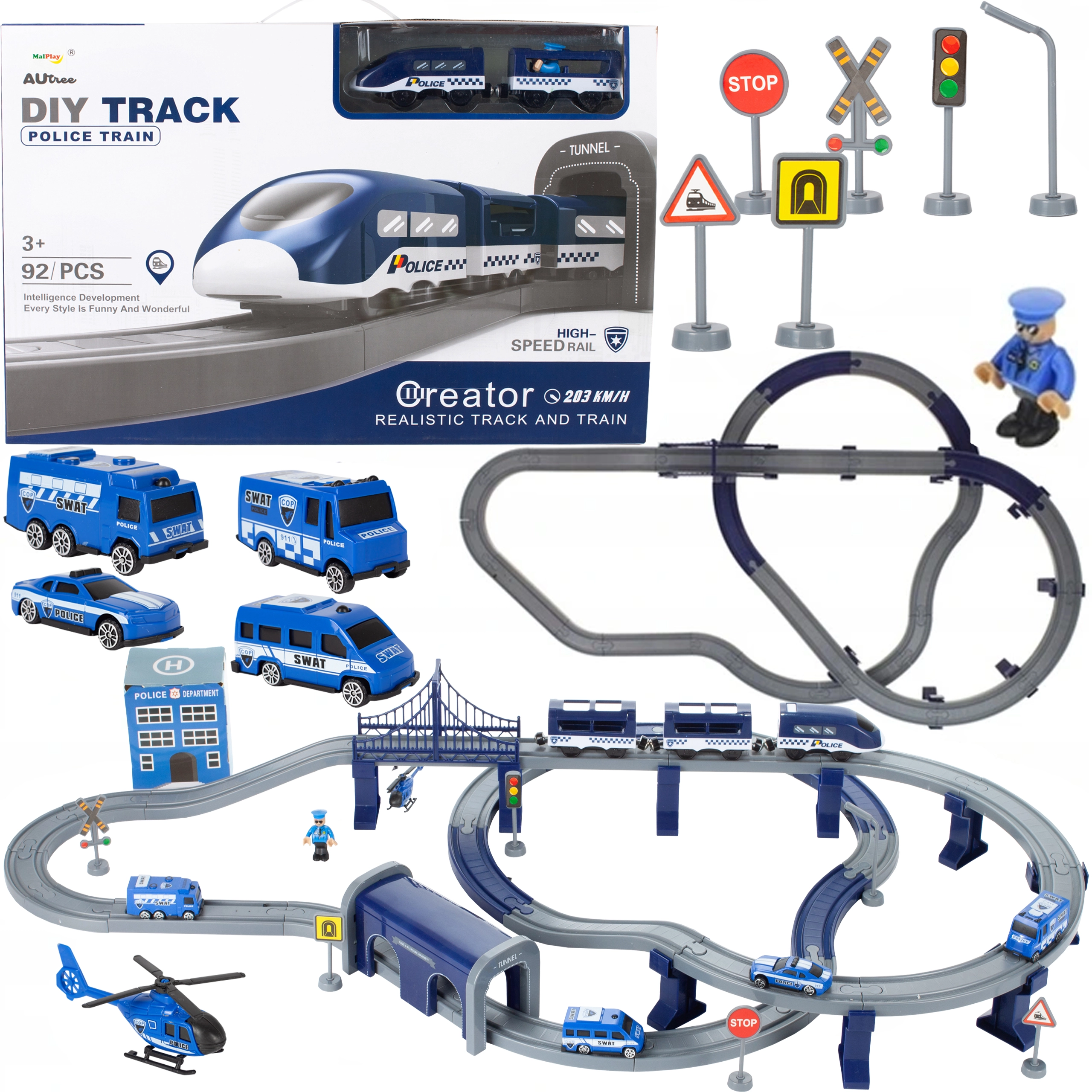 Komplektā iekļauti bagātīgi piederumi: divi vagoni, četras dažādas policijas automašīnas, policista figūriņa, iecirknis, tunelis, tilts, sliedes un balsti. Sliežu platums ir apmēram 4 cm, kas nodrošina stabilu braucienu un vienkāršu trases montāžu.