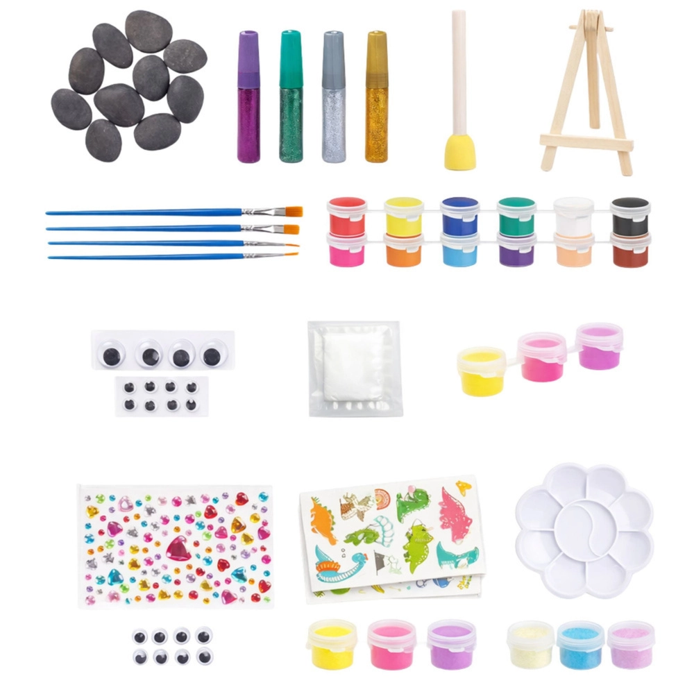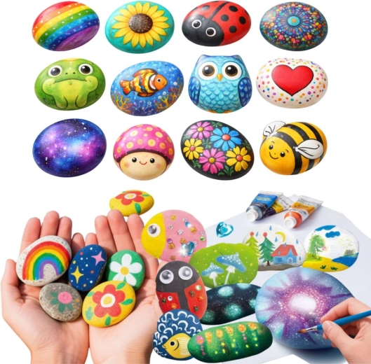 Gludi akmeņi, košas akrila krāsas, spīdumi, otas, palete, uzlīmes un actiņas – viss vienā kastītē, gatavs krāsošanai.
