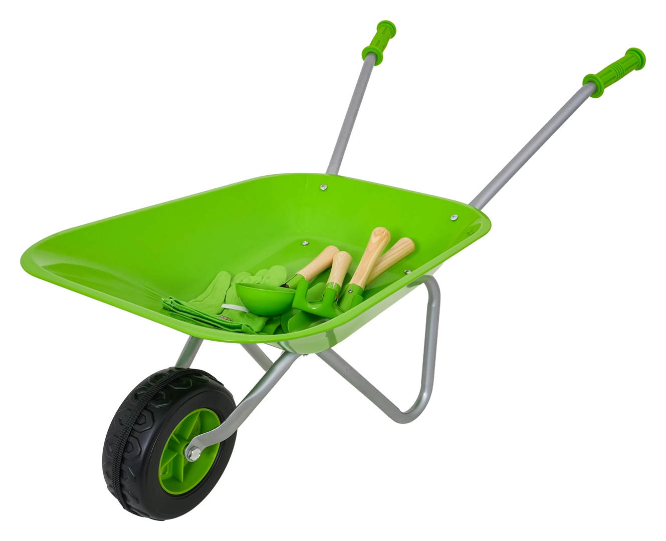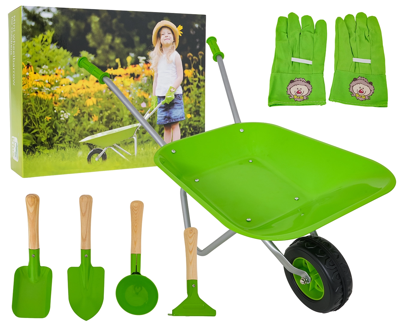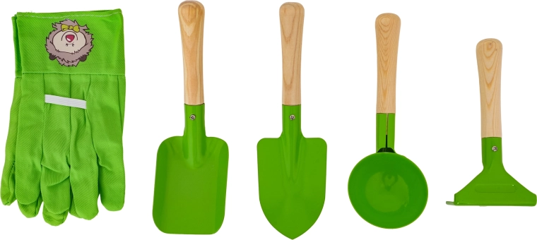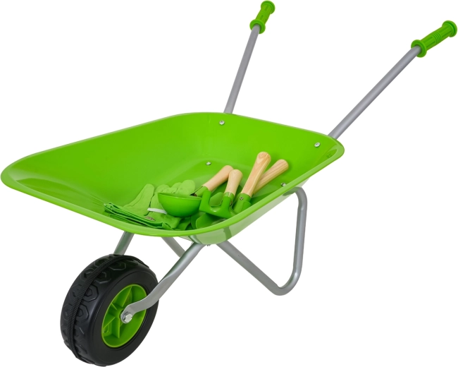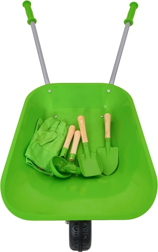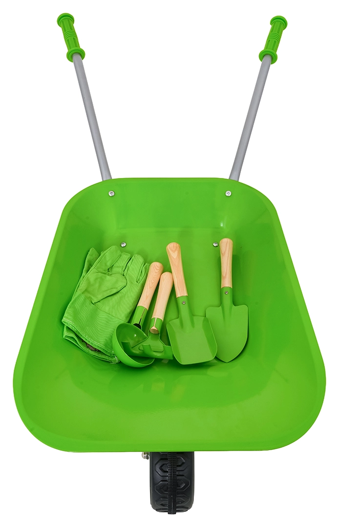 Komplets dārzkopībai bērniem no 3 gadu vecuma ar zaļu ķerru, izturīgiem metāla instrumentiem un ērtām cimdiem. Bērni droši izmēģinās rakšanu, augsnes irdināšanu un pārvadāšanu un iesaistīsies dārza darbos. Nerūsējoši uzgaļi ar koka rokturiem un vienkārša montāža nodrošina ilgu kalpošanu un ērtu lietošanu.