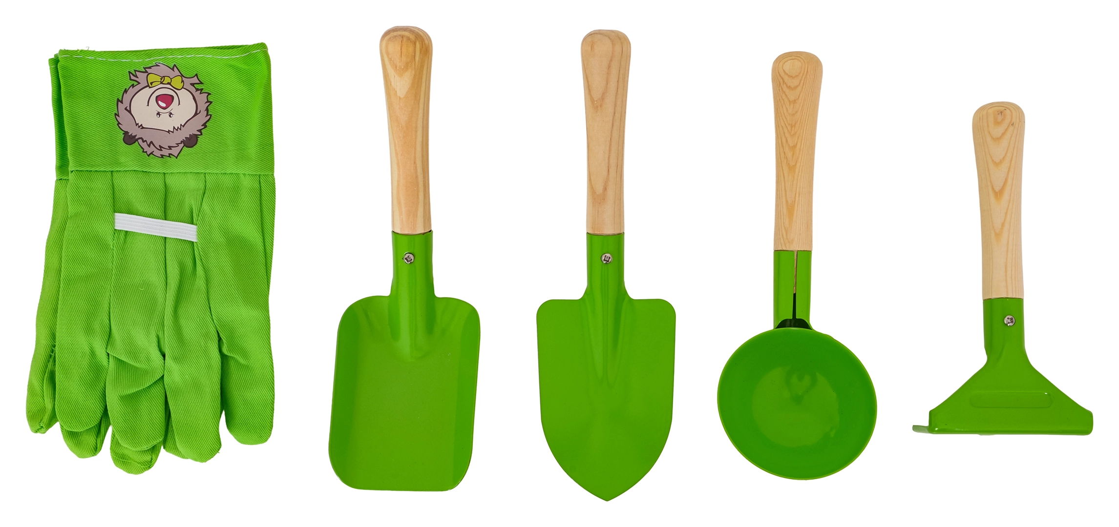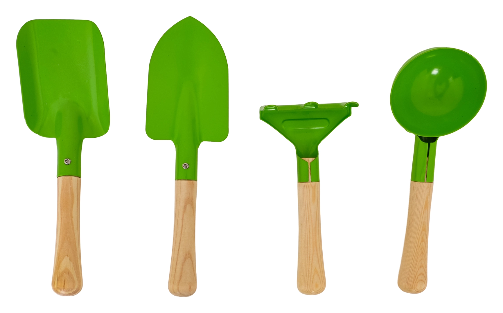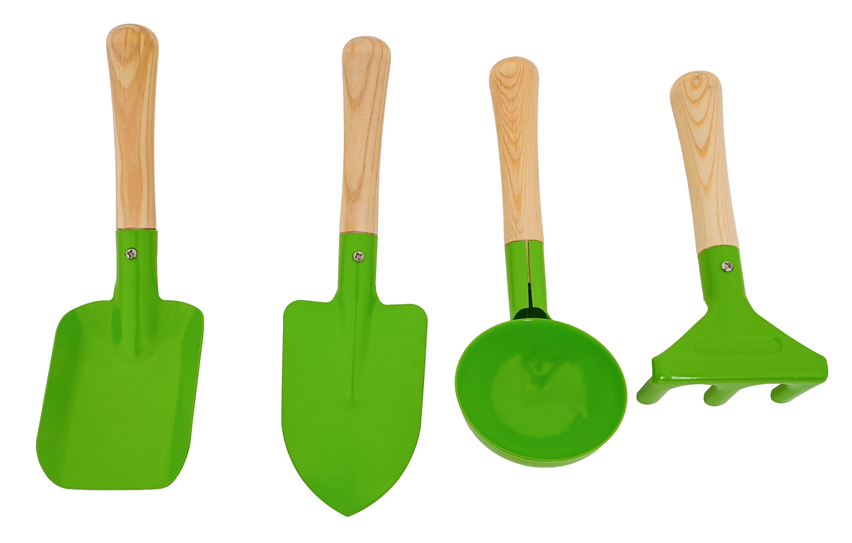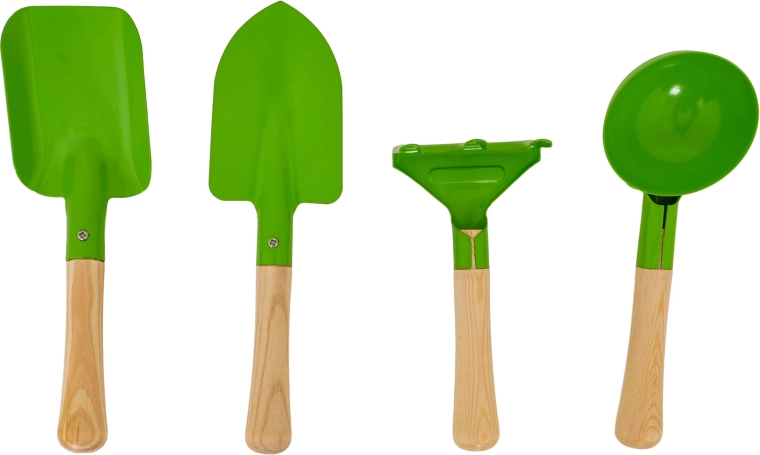 Komplektā ietilpst lāpstiņa, smails stādāmais īlens, apaļš kausiņš un mazas grābeklītes. Izturīgas metāla galvas un gludi koka rokturi nodrošina komfortu un ilgmūžību.