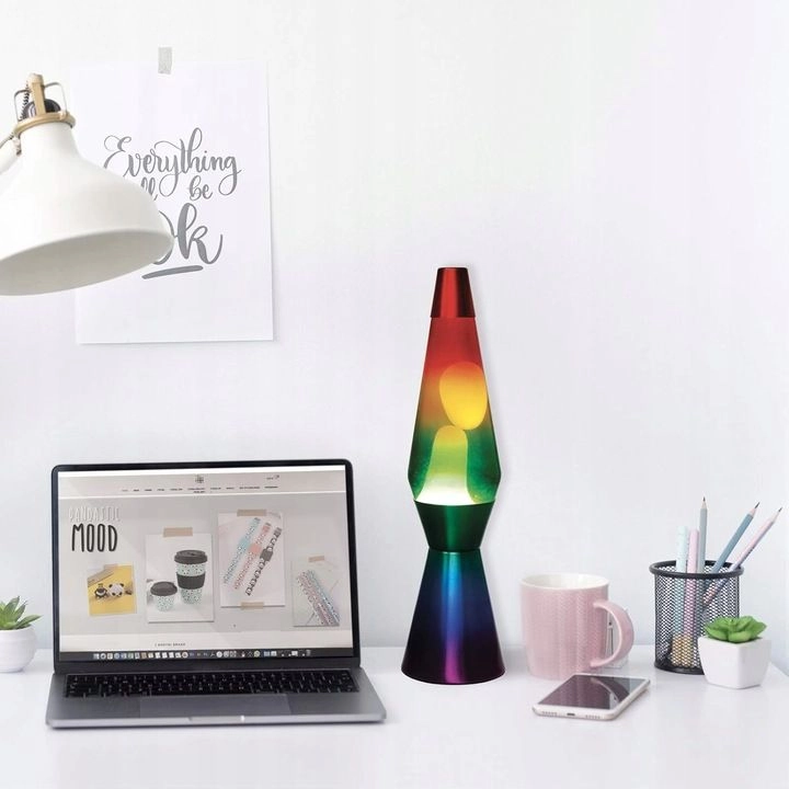 Atklājiet klasiskās lāvas lampas burvību modernā varavīksnes ietērpā. Plūstošais vasks siltā gaismā rada nomierinošu kustību, kas ir ideāla relaksācijai pēc saspringtas dienas un kā oriģināls aksesuārs viesistabā, guļamistabā vai kabinetā. Pateicoties 40 cm augstumam, tā izceļas kā pievilcīga dekorācija, neaizņemot pārāk daudz vietas.