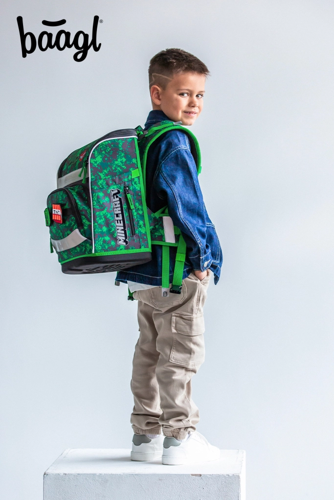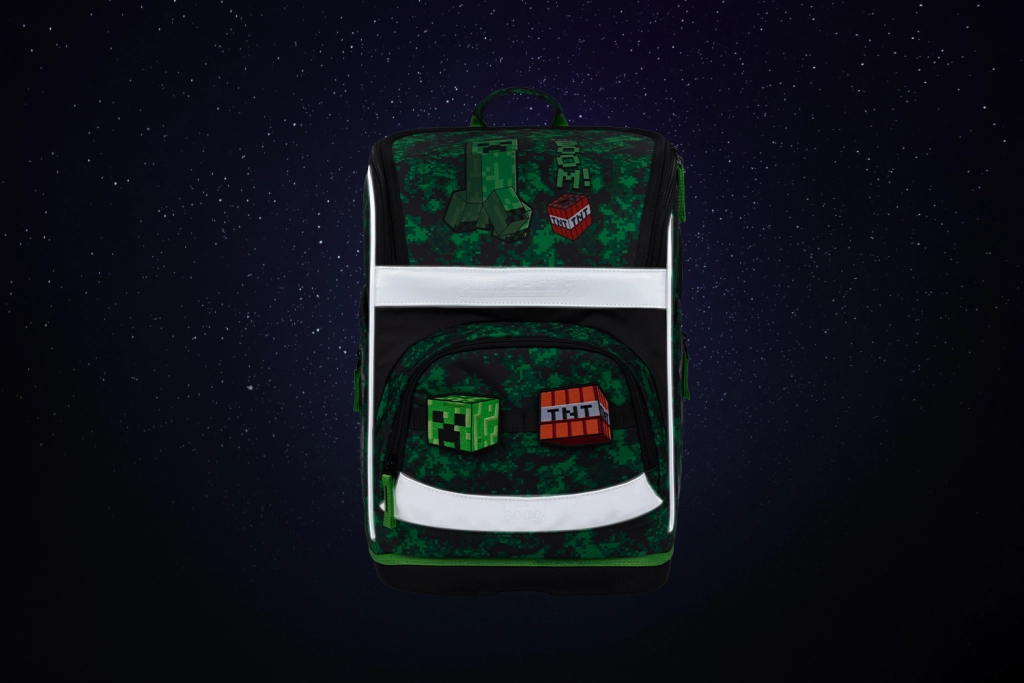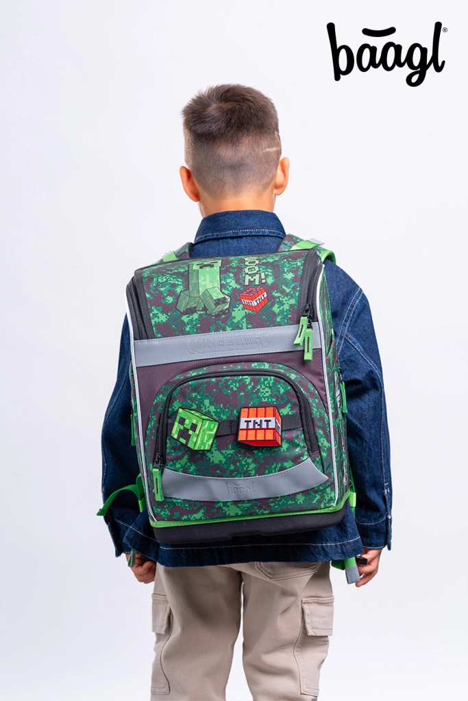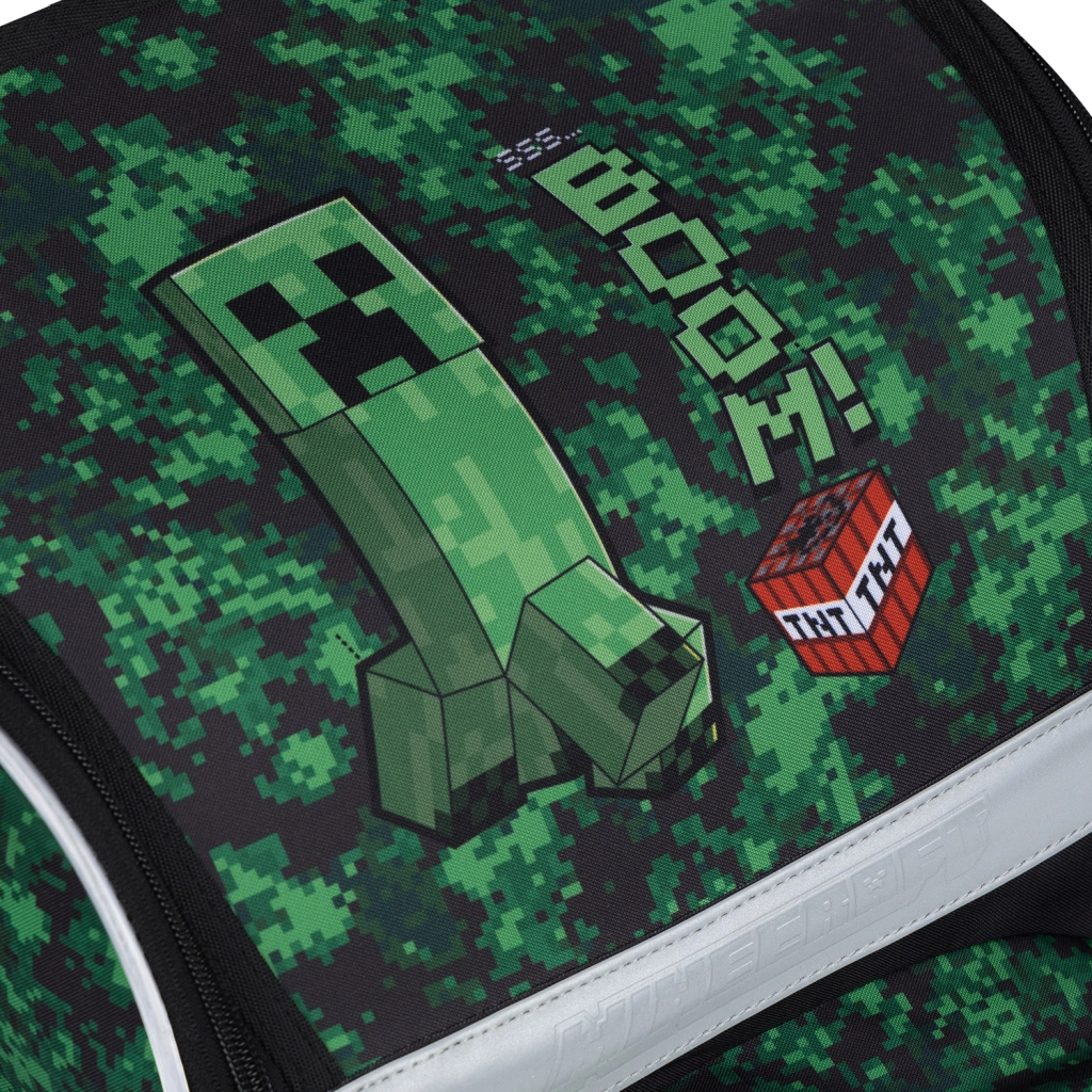 Visa komplekta dizainu rotā spēļu motīvi MINECRAFT ar pikseļu kamuflāžu un atstarojošiem elementiem labākai redzamībai. YKK rāvējslēdzēji nodrošina ilgu kalpošanas laiku un vienmērīgu aizvēršanu, bet pārstrādātie, ūdensizturīgie materiāli iztur intensīvu skolas ikdienu.