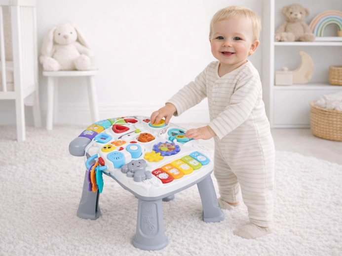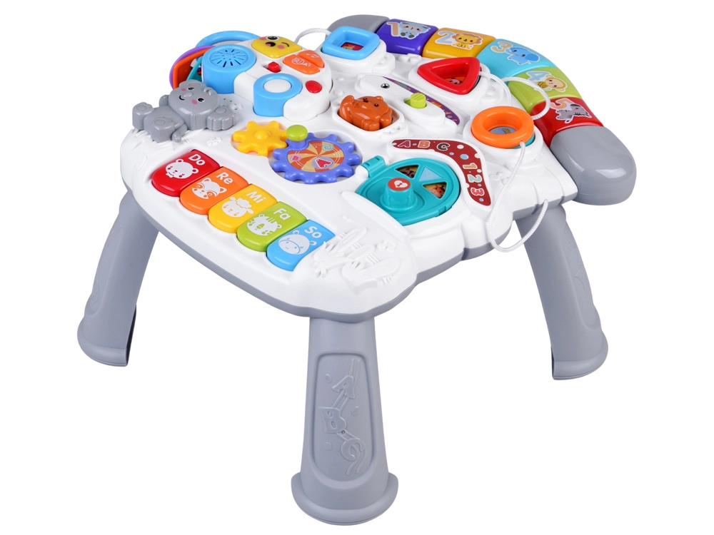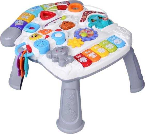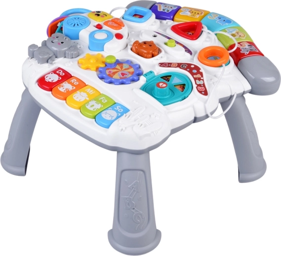 Krāsains interaktīvs galdiņš pašiem mazākajiem ir neliels atklājumu un mūzikas centrs. Tas piedāvā gaismas efektus, melodijas, mini klavieres Do-Re-Mi, griežamus zobratus, formu un dzīvnieciņu pogas, noņemamu mašīnīti ar atslēgām un arī mikrofonu. Attīsta sīkās motorikas iemaņas, roku–acu koordināciju, māca krāsas, formas un skaņas un veicina patstāvīgu spēli.