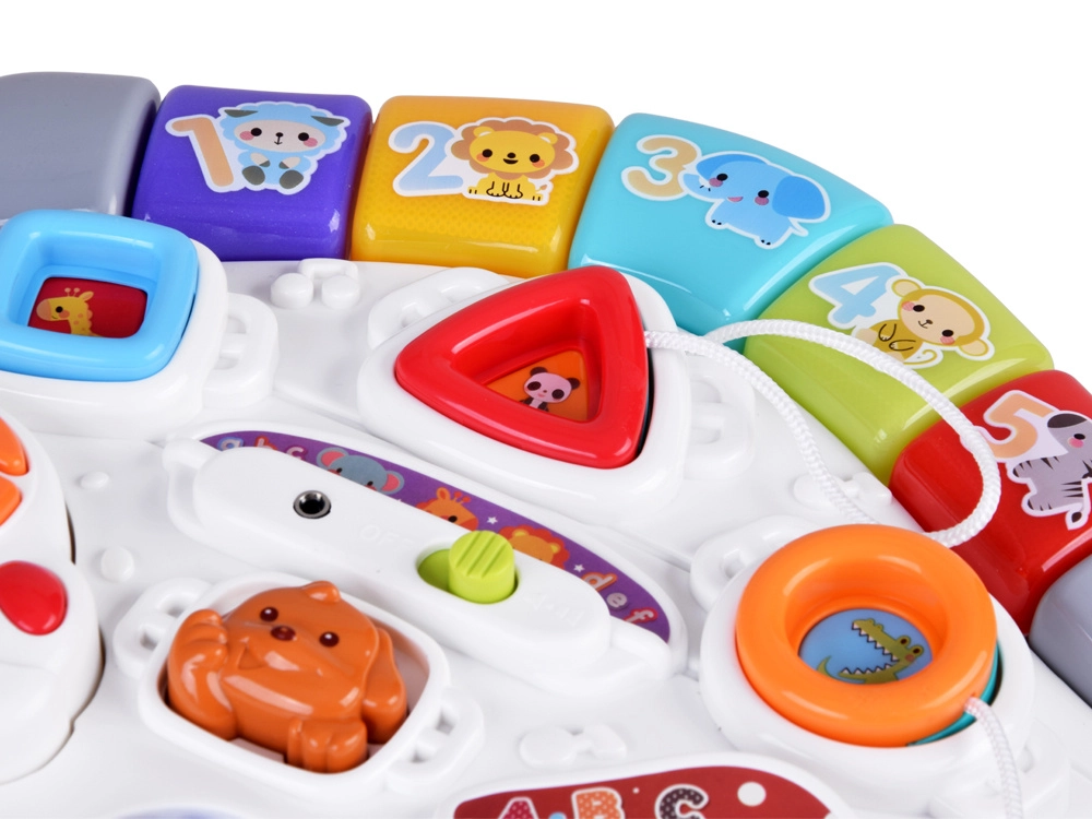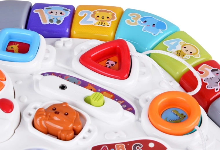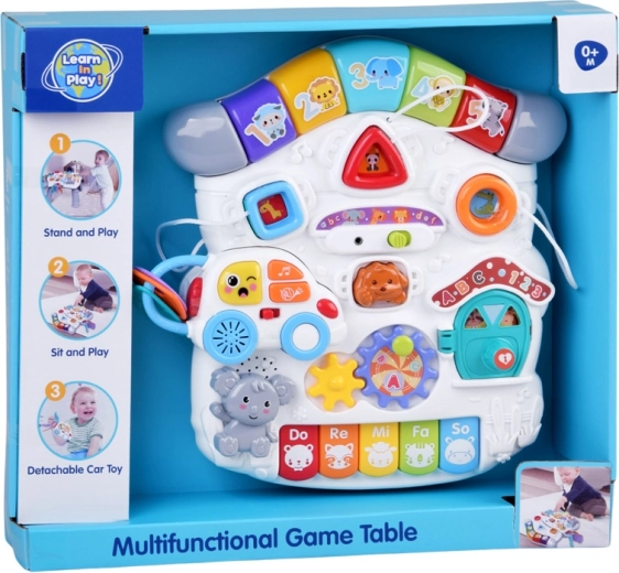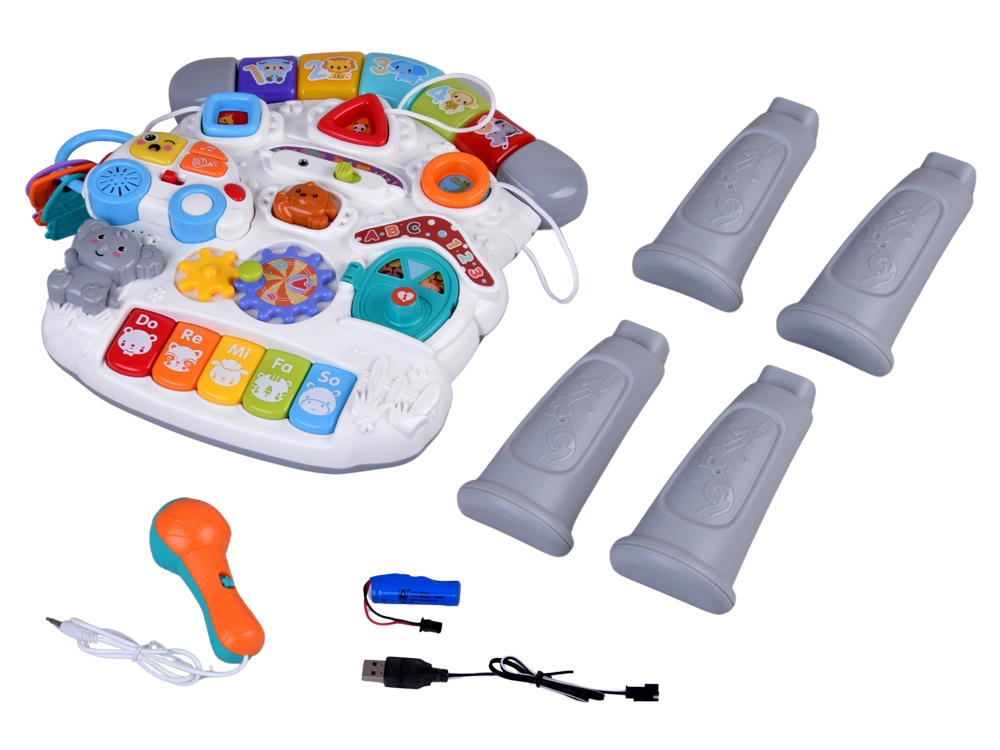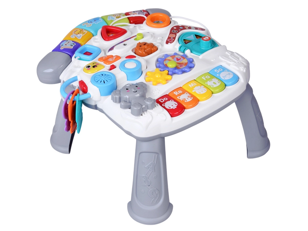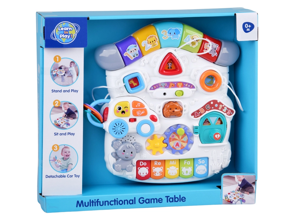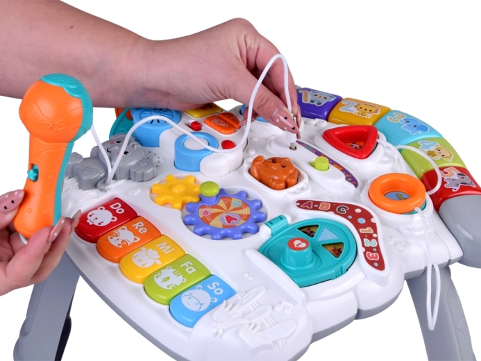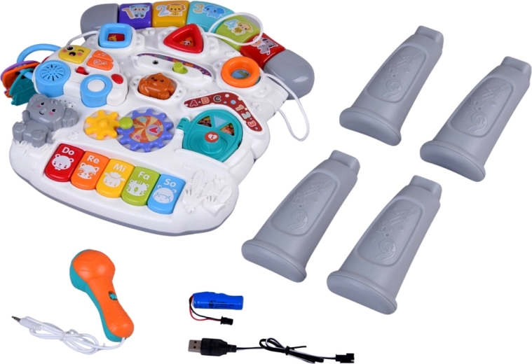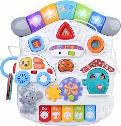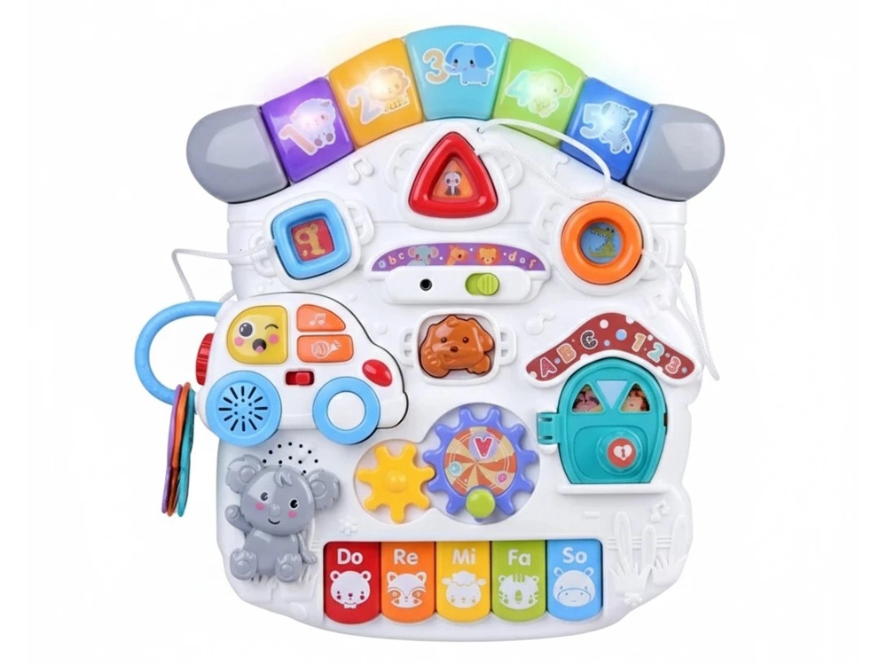 Mūzikas panelis ar Do–Re–Mi klaviatūru, mikrofonu un jautriem efektiem veicina maņu attīstību un ritma sajūtu. Formu panelis palīdz iepazīt krāsas, formas un dzīvniekus, savukārt noņemamā mašīnīte ar atslēgām izklaidēs arī ārpus galdiņa. Pateicoties bagātīgajai mijiedarbībai, bērni trenē satvērienu, koncentrēšanos un loģisko domāšanu.
