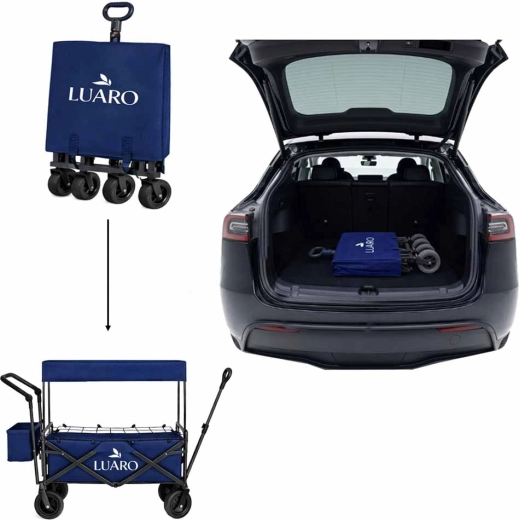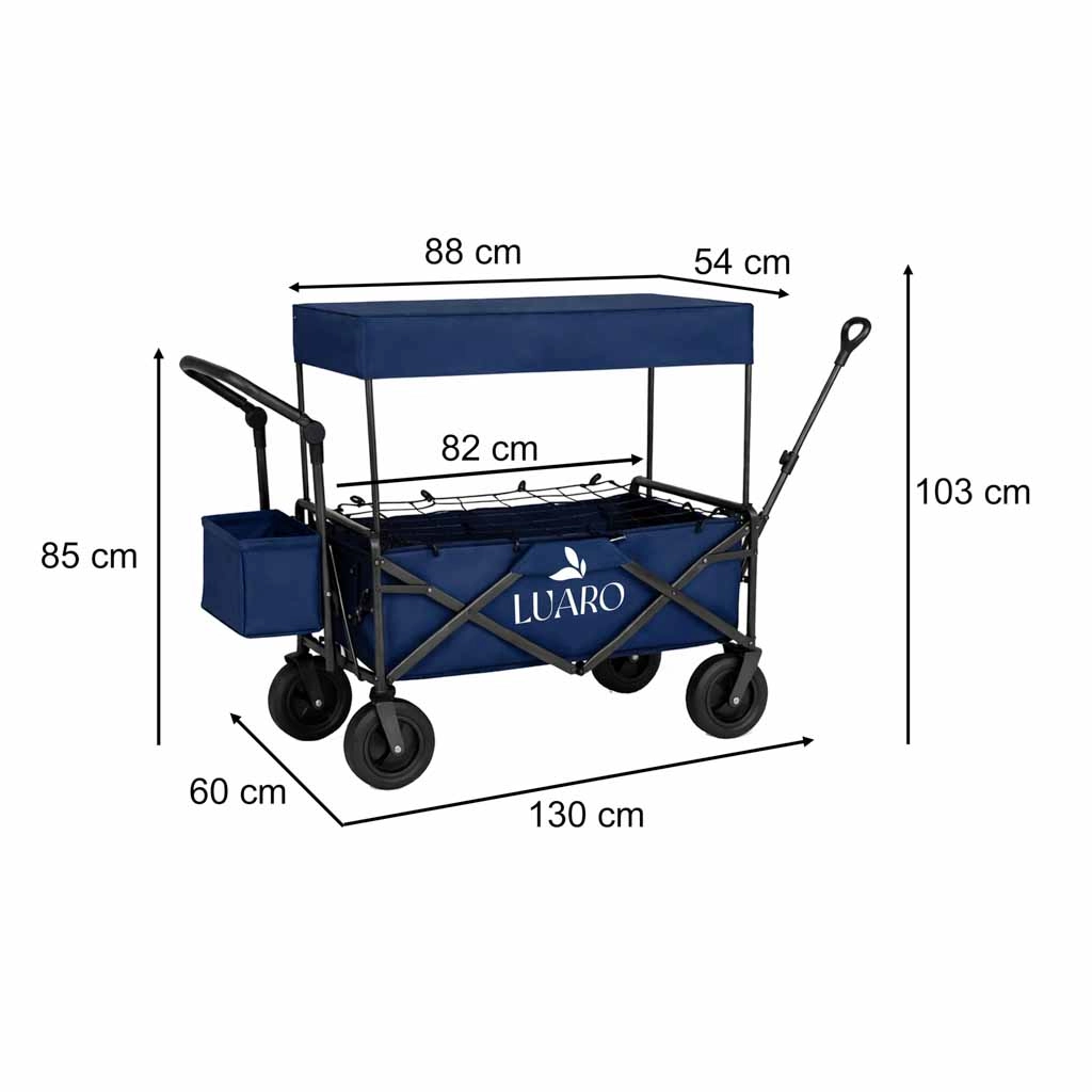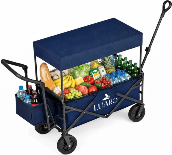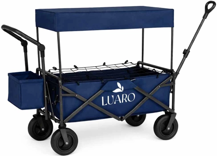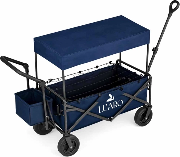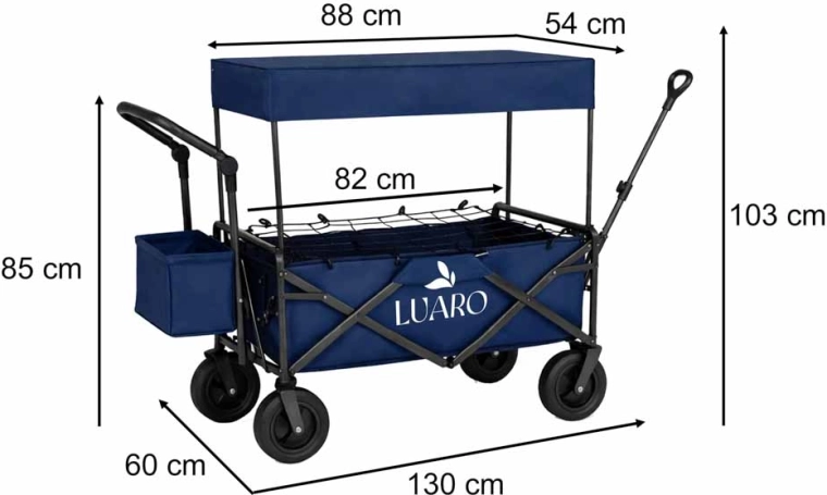 Universālie saliekamie ratiņi LUARO ar jumtiņu atvieglo lietu pārvadāšanu uz pludmali, kempingu vai pilsētā. Pateicoties izturīgai konstrukcijai, platiem bezceļa riteņiem, grozāmiem priekšējiem ritenīšiem un regulējamām roktura svirām, ratiņus ir viegli vadīt. Praktiskais jumtiņš pasargā saturu no saules un viegla lietus, sānu kabatas un grozs nodrošina pārskatāmu glabāšanu nepieciešamajām lietām.